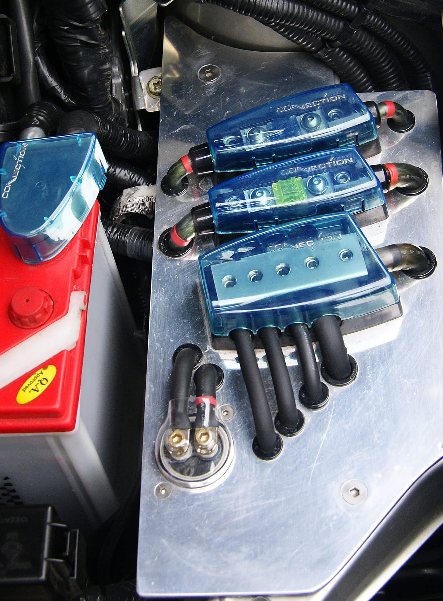 Pendawaian keseluruhan sistem ini juga dibuat dengan sangat teliti. Hanya kabel speaker dan amplifier bermutu tinggi dipilih untuk menerajui keseluruhan sistem. Di lokasi tertentu di mana kabel lebih terdedah kepada suhu panas dan mudah beralih posisi, ia telah dibalut dengan lapisan busa khas. Dari punca kuasa bateri kepada pemain dan speaker, sebanyak enam unit fius 100amp Connection dipasangkan. Bukan sahaja berfungsi cemerlang menyekat kuasa berlebihan, QQQ Audio World memasangnya dengan cara tersendiri. Di bahagian bateri kereta, plet aluminium khas dijadikan platform untuk 3 unit fius sementara di bahagian dalam, fius ini sengaja didedahkan di bahagian konsol tengah, betul-betul di bawah din pemain Pioneer tersebut.