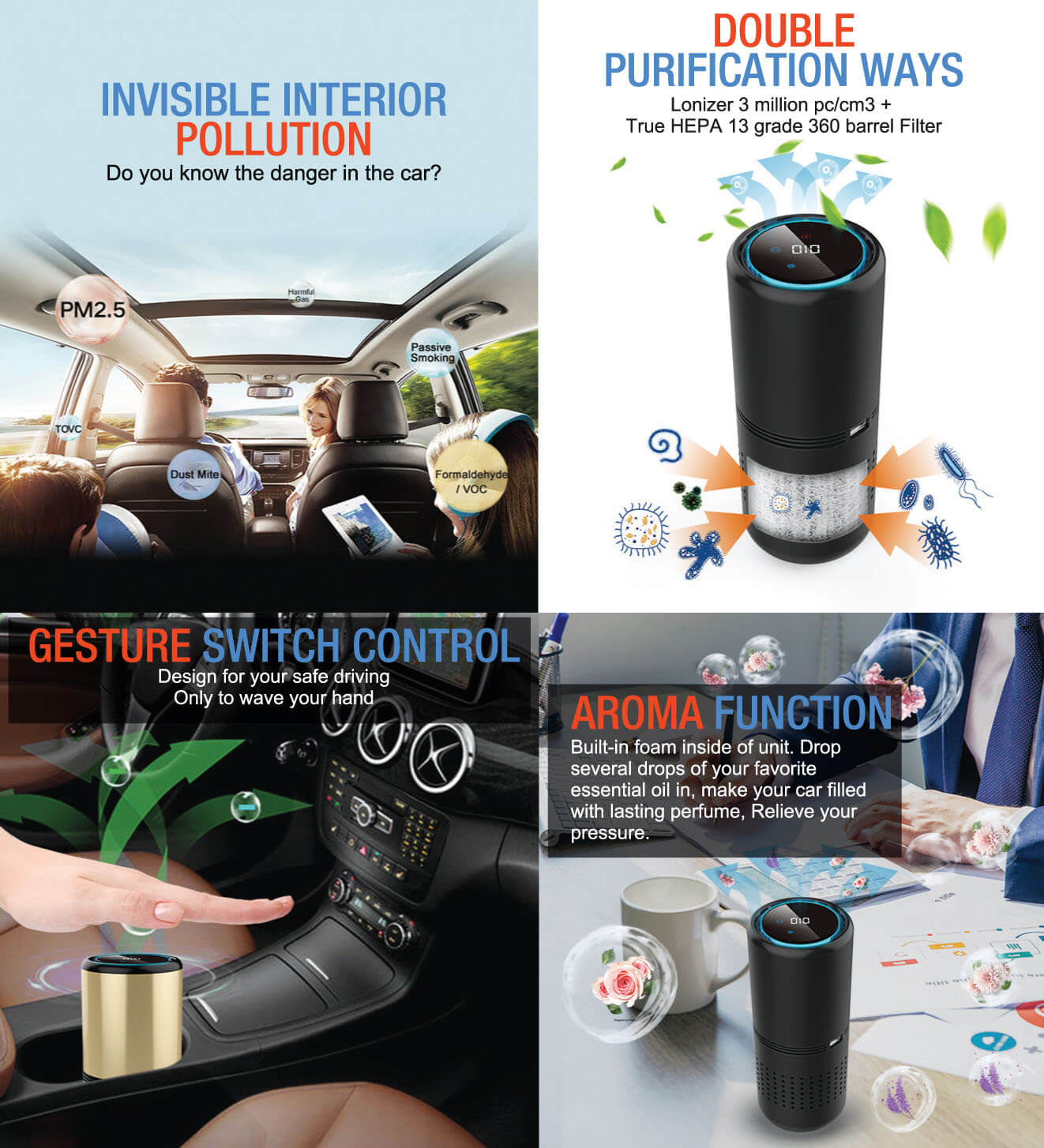 Pembersih udara ini menawarkan dua cara iaitu pengionan (ionizer) dan penapisan (filter). Hanya perlu pergerakan tangan untuk mengaktifkan dan mengawal pembersih udara ini. Ia juga didatangkan dengan aroma yang menyegarkan, monitor PM2.5, ion negatif, penapis HEPA13 berserta lampu LED 4 warna. Lampu LED ini bernyala berdasarkan data PM2.5 dan keempat-empat warna menandakan kualiti udara yang berbeza.