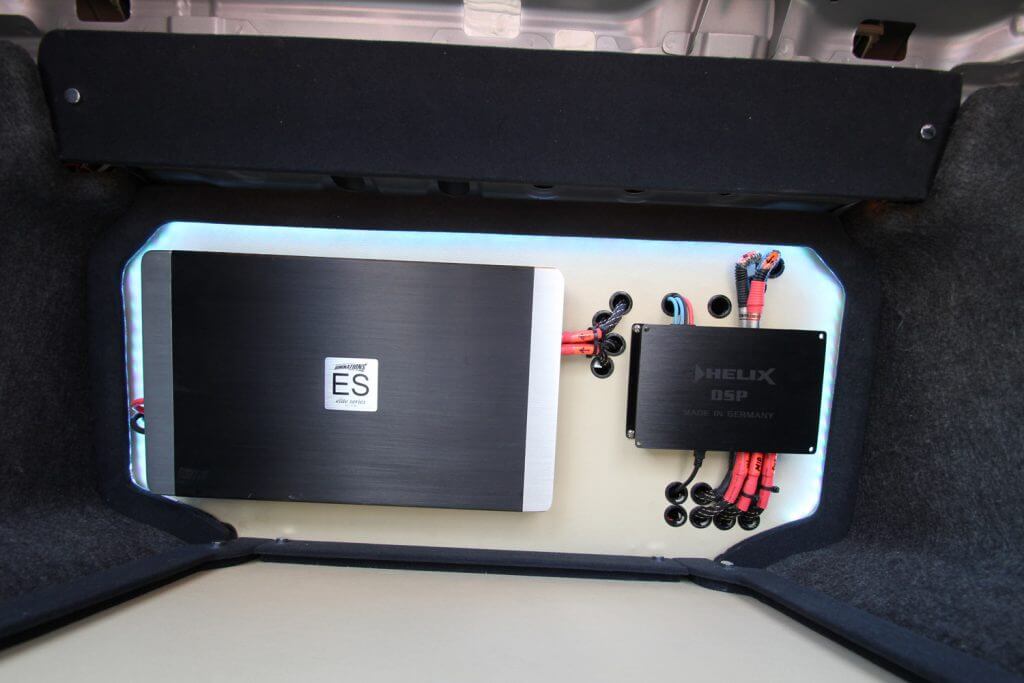Berikutnya, seunit woofer 12” dari Dominations dipasangkan untuk melengkapi sistem audio ini. Pemasangannya pula mudah; ditanamkan di bahagian belakang tetapi bukan di tapak ruang letak barang. Sebaliknya di dindingnya yang turut disertai dua unit amplifier dan pemproses Helix tadi sekaligus tidak memakan sedikitpun ruang tempat meletak barang. Dalam masa yang sama, sesuai untuk dijadikan kereta harian. Perumpamaan sahaja kerana kereta ini memang jelas dibina untuk menyertai pertandingan. Kereta juara, bukan juara ke pasar.