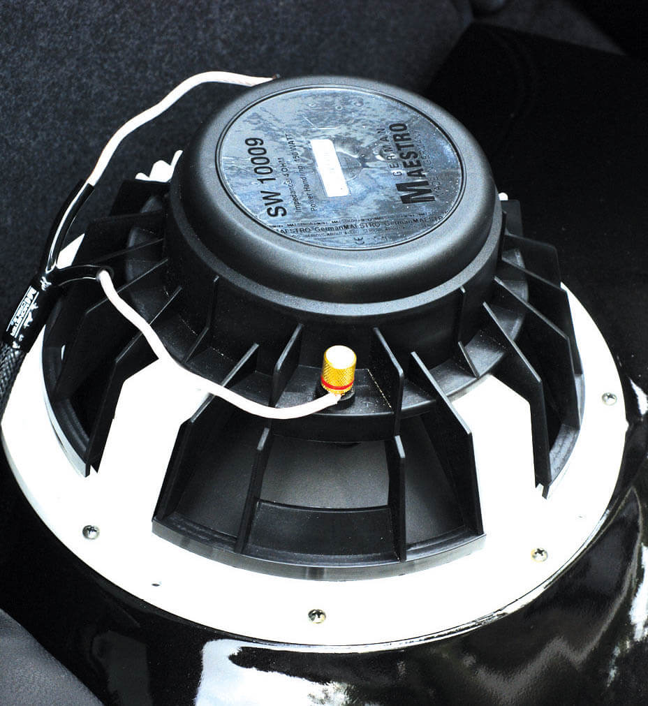 Satu lagi unit Crossfire BM 600.4700 telah diyakini untuk memandu 2 unit subwoofer German Maestro 10” yang ditanam di dalam enclosure custom pada but belakang. Subwoofer ini dipasangkan secara terbalik atau lebih dikenali sebagai reverse. Ia adalah salah satu cara mendapatkan bunyi bass frekuensi rendah paling bagus. Jika anda biasa dengan subwoofer jenis aktif, biasanya teknik reverse ini diaplikasikan sebagai satu pilihan. Tetapi itu cuma efeknya sahaja sedangkan jika dipasangkan secara fizik begini, kualiti bunyinya memang tidak dapat ditandingi. Bagaimanapun, teknik begini sesuai untuk mereka yang mahukan ‘kedalaman’ (depth) bunyi dan bukannya dentuman semata-mata.
