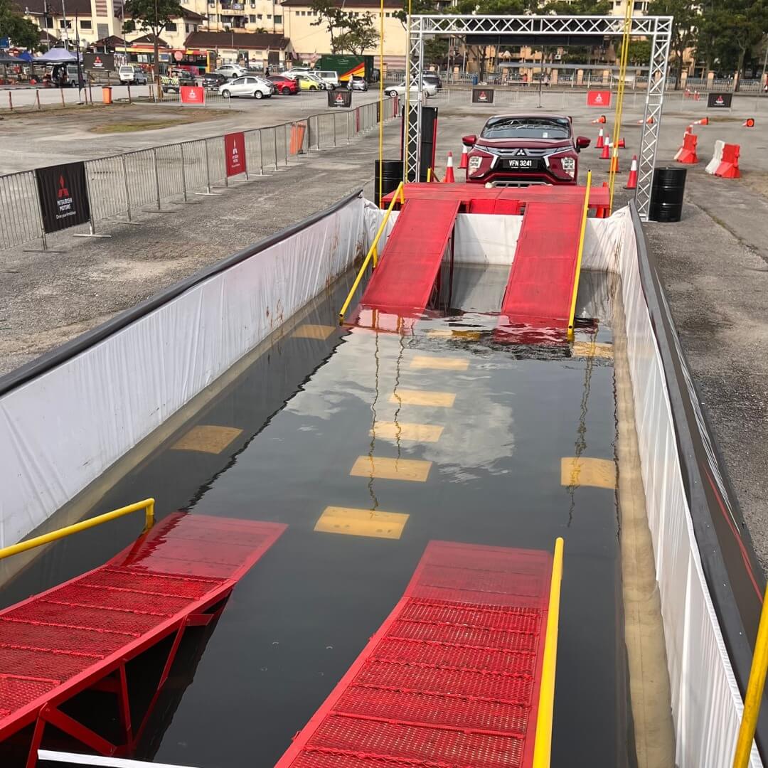Peserta perlu mengharungi air untuk mempamerkan ketahanan serta kepelbagaian XPander dalam mengharungi laluan berliku termasuk banjir kilat dengan jarak setinggi 205mm.