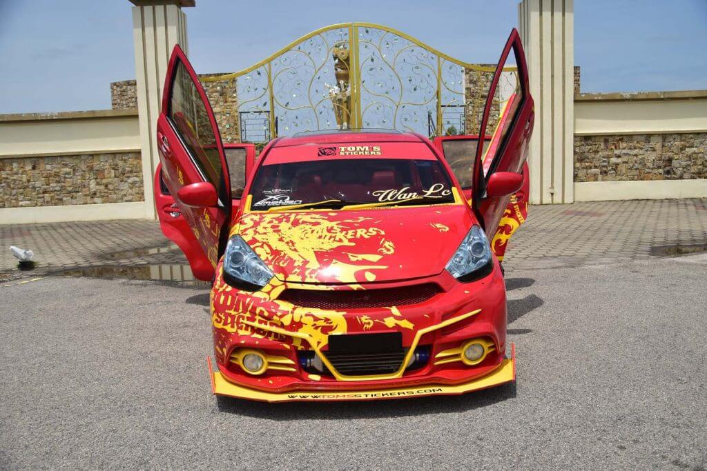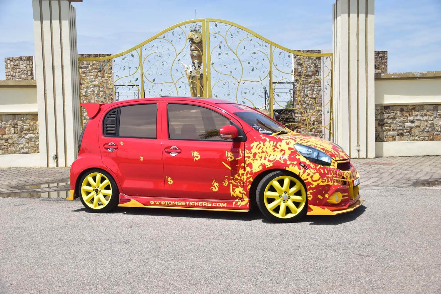 Bercakap tentang minat, Wan LC berjaya melakarkan impian dan minatnya ke atas Myvi ini. Bertugas sebagai kontraktor, Wan LC yang sudah berusia 31 tahun ini atau mengikut kategori pembahagian umur terbaharu bukan lagi golongan belia, beliau telah memilih untuk menggunakan Tom’s Sticker sebagai pelekat keretanya. Gabungan warna merah dan kuning tampil meriah dan bergaya tetapi kedua-duanya sinonim dengan negeri Selangor. Andai kata Myvi ini diletakkan di stadium ketika perlawanan bola sepak berlangsung antara Selangor dan tempat asal Wan iaitu Alor Setar, Kedah, masak dibuatnya.
