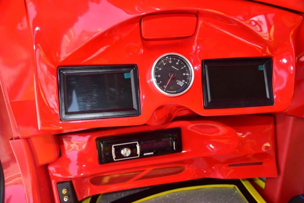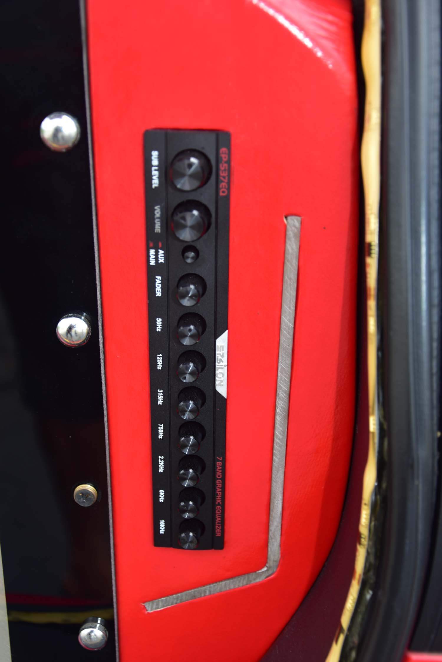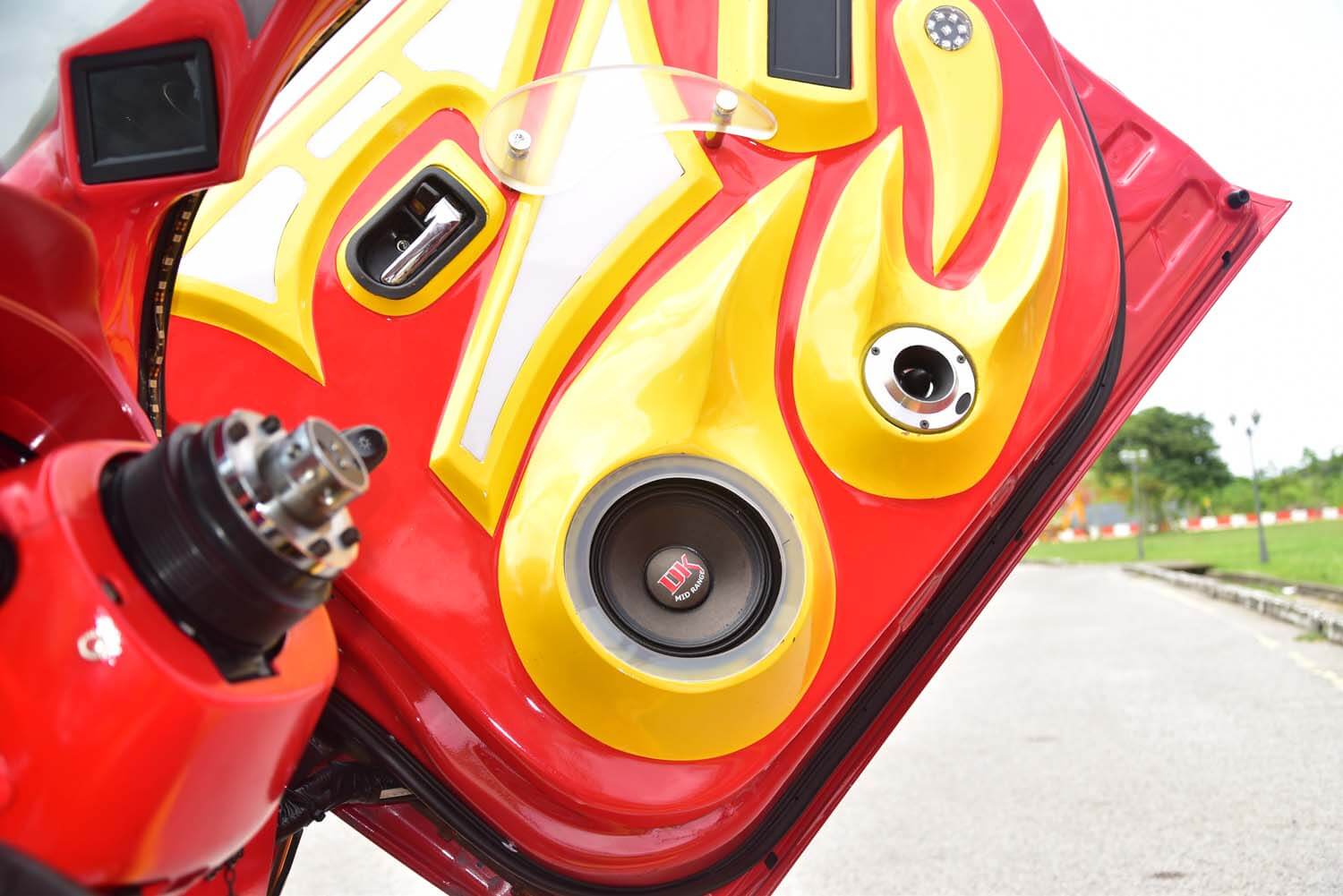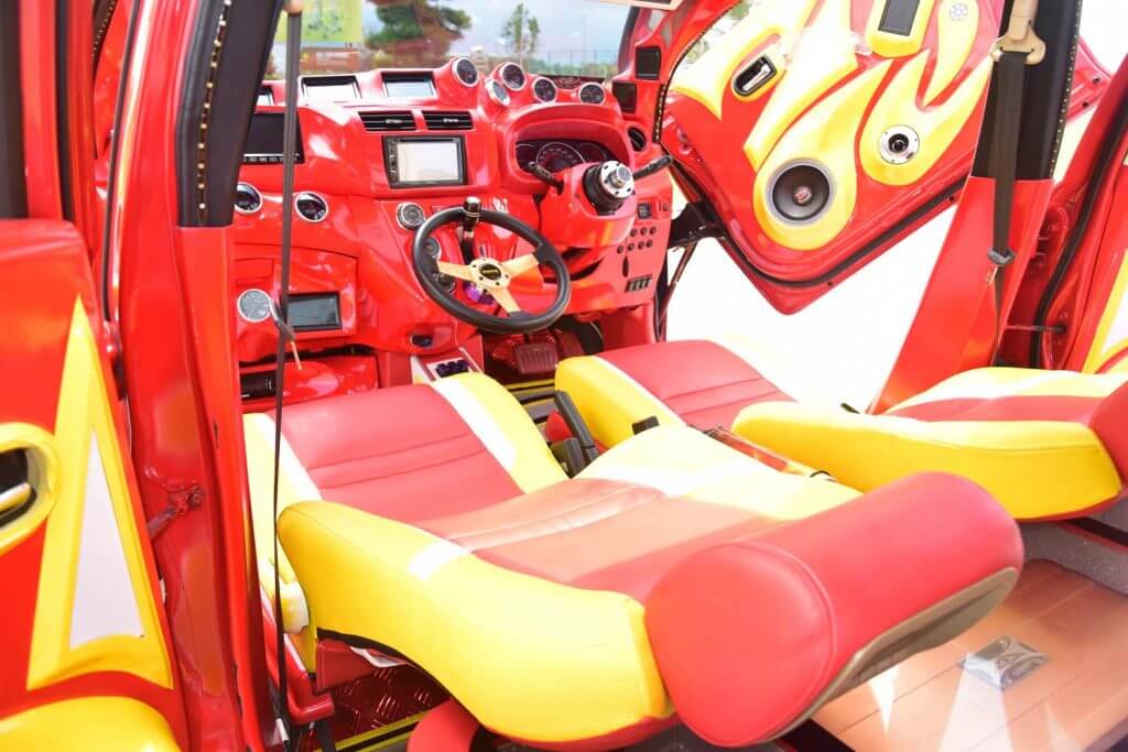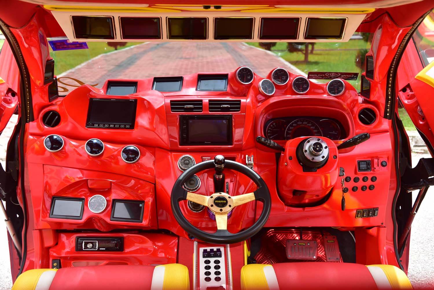 Bertugas sebagai kontraktor, Wan LC tidak menghadkan kerja-kerja modifikasi hanya kepada sistem audio. Seperti yang boleh dilihat, seluruh bahagian Myvi ini telah dimodifikasi. Jika di bahagian luarnya Wan LC memilih logo Tom’s Sticker dan mengambil semangat naga, bahagian dalam pun tidak kurang hebatnya. Mengekalkan gabungan warna merah dan kuning, terdapat warna putih sebagai penambahan membuatkan ia kelihatan lebih menarik.