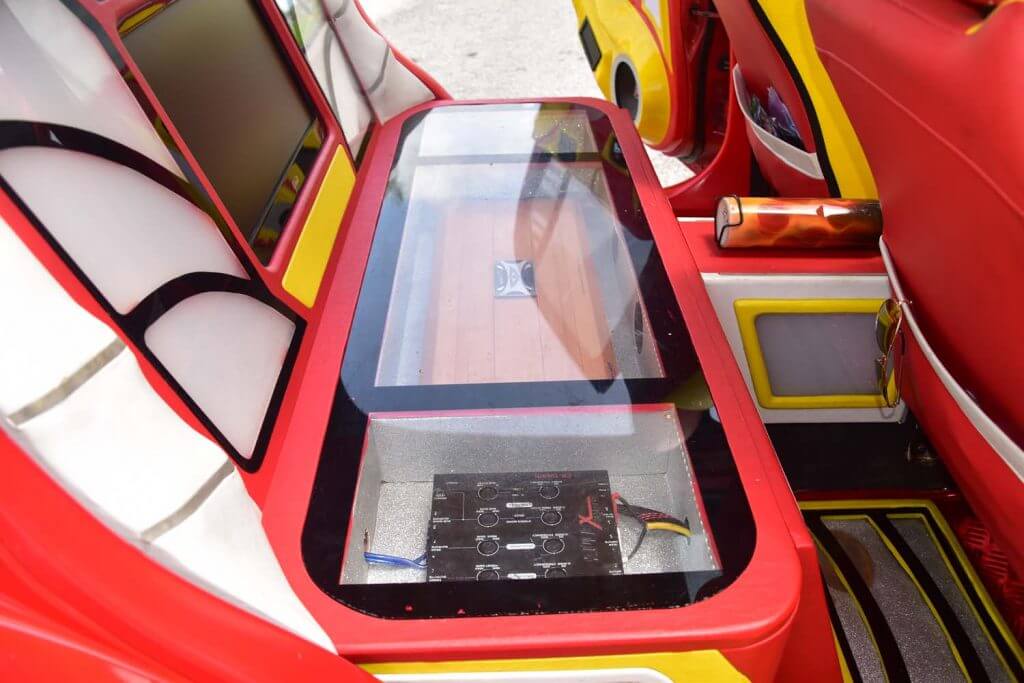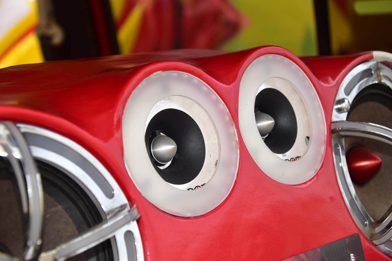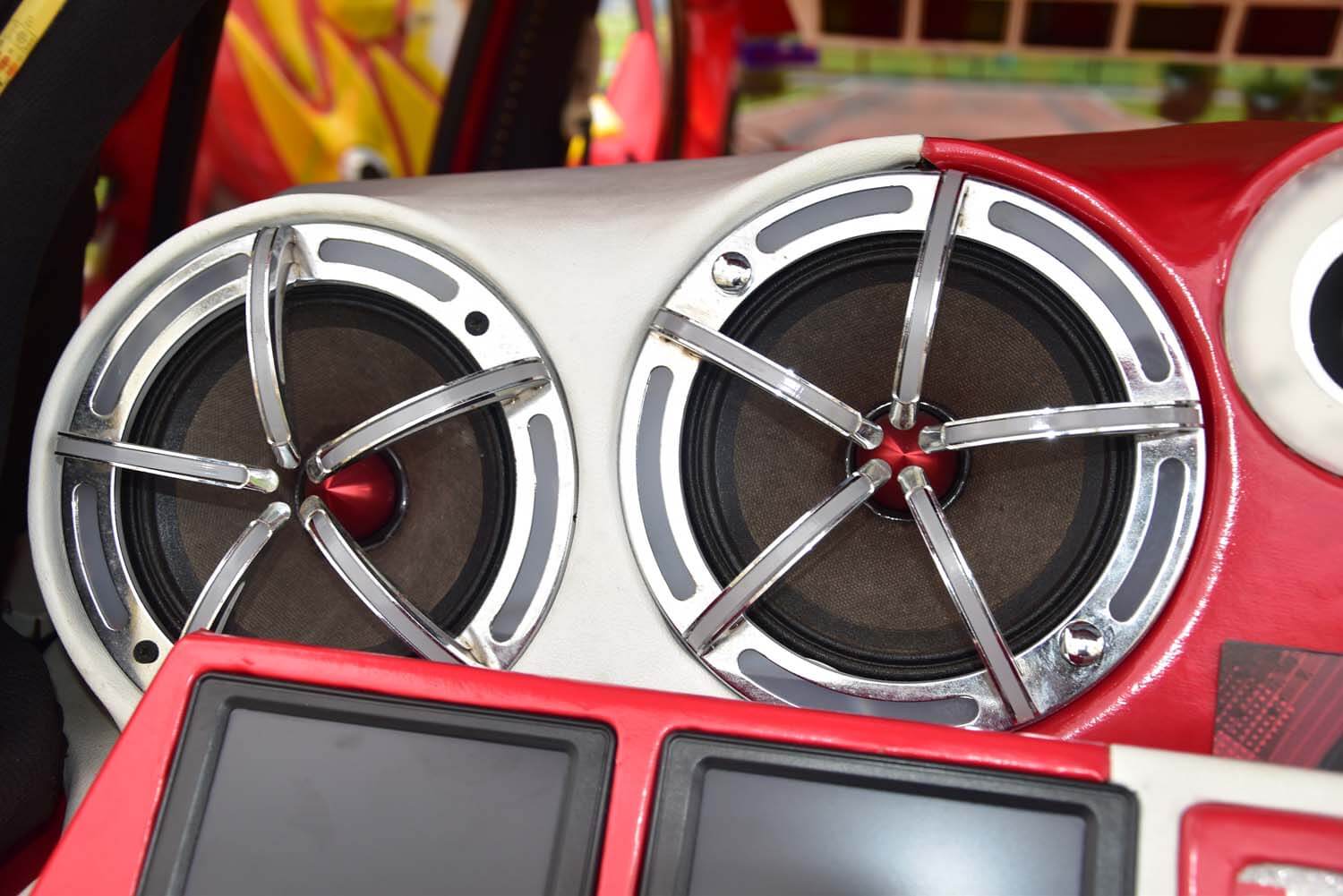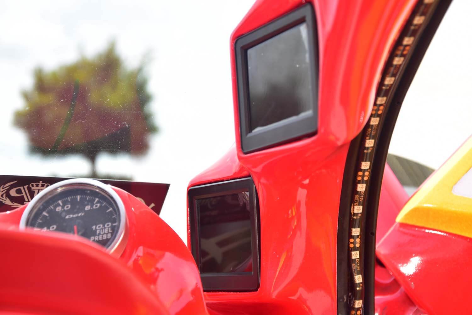 Mengakhiri sistem audio Myvi ini adalah 2 unit woofer King Dom yang disimpan dalam sebuah peti kaca arkilik khas dan untuk menyerlahkan kewujudannya, pelekat berkilat-kilat telah ditampal di dinding belakangnya. Tidak cukup dengan itu, Wan LC menambahkan lagi hiburan dari segi visual pula. Kalau dikira dengan teliti, sebanyak 25 unit monitor telah dipasang hampir di setiap ruang yang ada di bahagian dalam dan seunit bersaiz 15 inci dipasangkan di bahagian belakang, di mana sepatutnya menjadi tempat duduk penumpang.