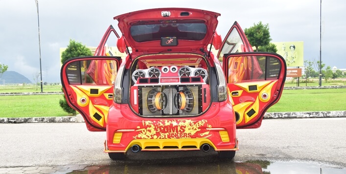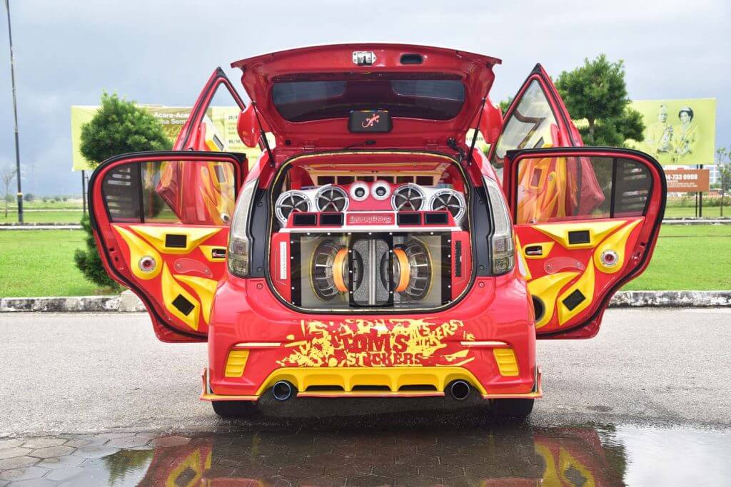 Sekiranya berminat untuk membuat pemasangan berani dan unik seperti Myvi ini, anda boleh kunjungi dan rujuk UTI Audio yang beroperasi di Sungai Petani. Pemasangan kusyen yang kemas dan cantik ini pula hasil Samad Kusyen yang juga dari Sungai Petani. Oh ya, pelekat kereta pula hasil kerja tangan Tom’s Sticker, Alor Setar.