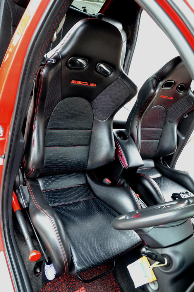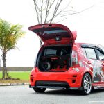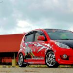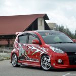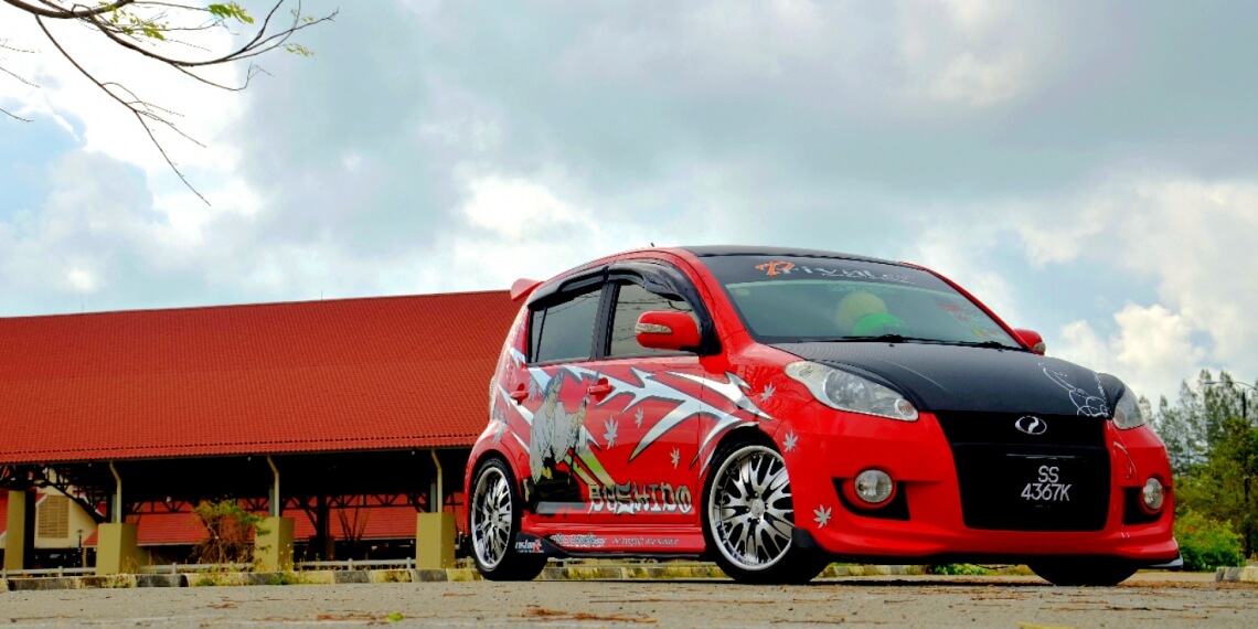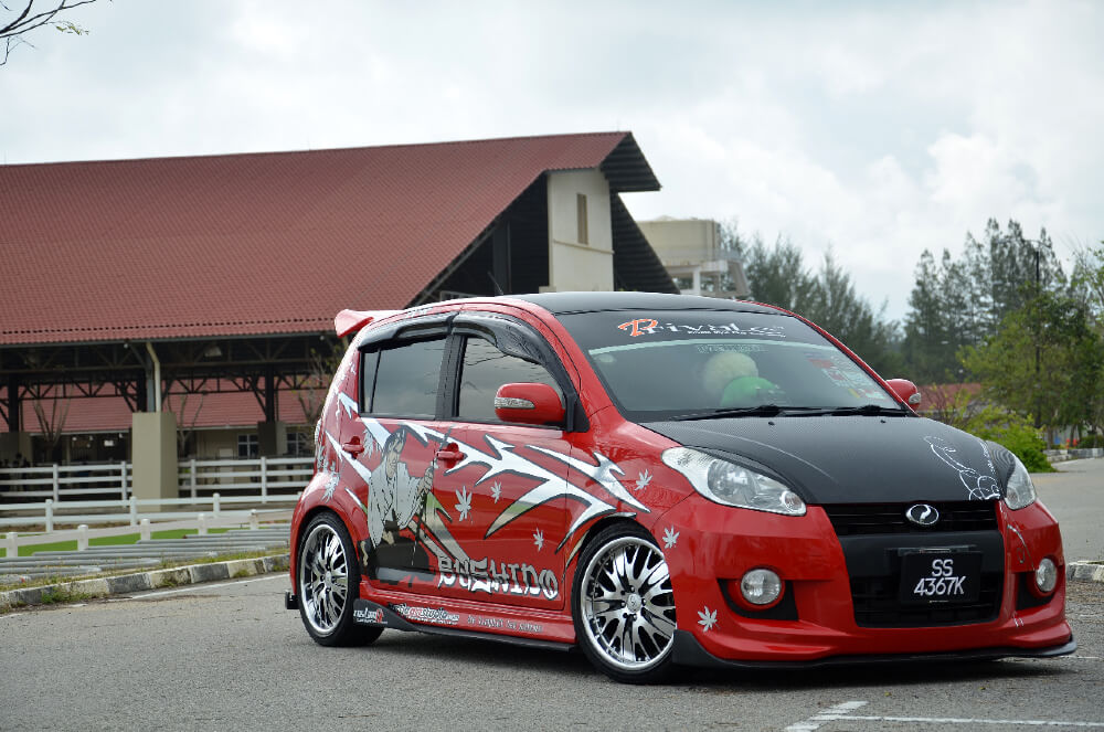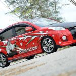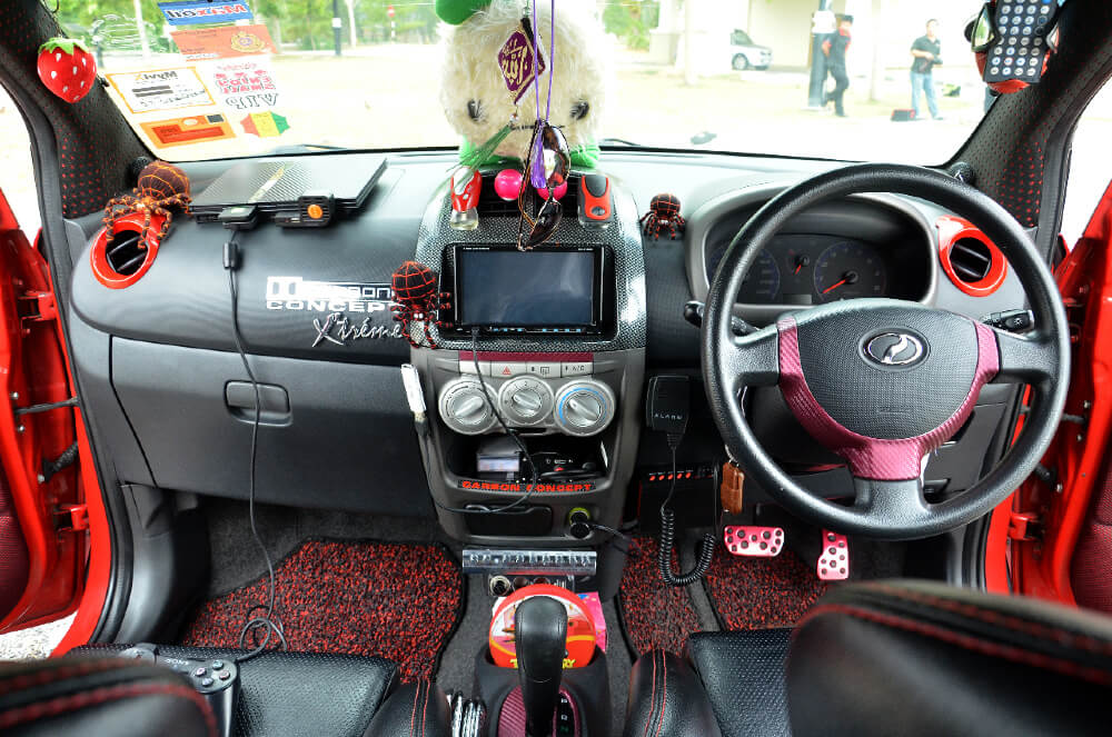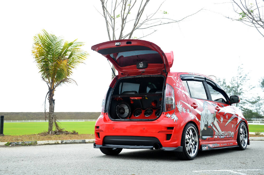 Kit sampingan yang dikenakan seperti lips dan skirting sisi hitam kelihatan kontras dengan warna merah. Badannya dilitupi pelekat Bushido yang kelihatan tidak keterlaluan, mungkin kerana hanya warna perak-hitam digunakan. Kalau sistem bunyi dijadikan perbandingan dan modifikasi diambil markah, Myvi ini memang layak menang podium pertandingan. Kemas dan sempurna. Kalau kereta ini diletakan di dinding facebook, pasti ramai yang tekan ‘LIKE’. Saya Like, anda bagaimana?