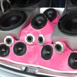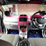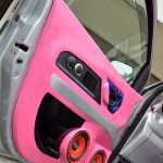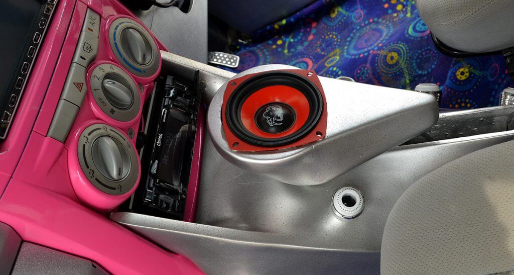 Sebaik pintu dibuka, barulah kelihatan betapa meriah bahagian dalamannya. Papan pemuka kereta ini menerima kerja fabrikasi warna pink dengan perak dan sepasang perumah yang menempatkan seunit mid bass Anaconda yang digandingkan bersama dengan seunit tweeter Black General B-2508. Perumah ini dibuat berasingan dan diletakkan di penjuru kedua-dua sisi papan pemuka tadi. Set ini mendapat bekalan kuasa daripada seunit amplifier 4 channel Black General B-2480 yang mana didahului dengan seunit pre-amp 7 band B-788 yang juga dari Black General. Oh ya, sebelum itu, pemain utama DXZ586USB dari jenama Clarion telah digunakan untuk mengepalai sistem audio ini.