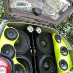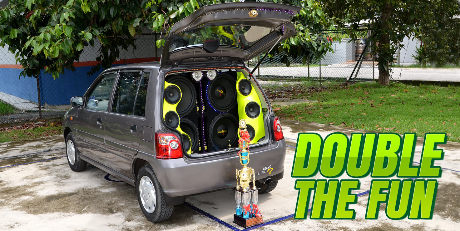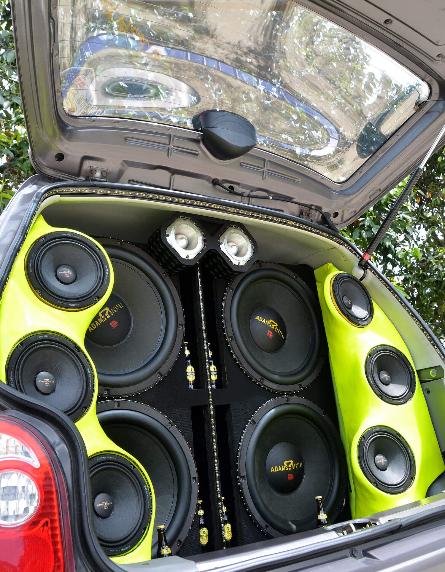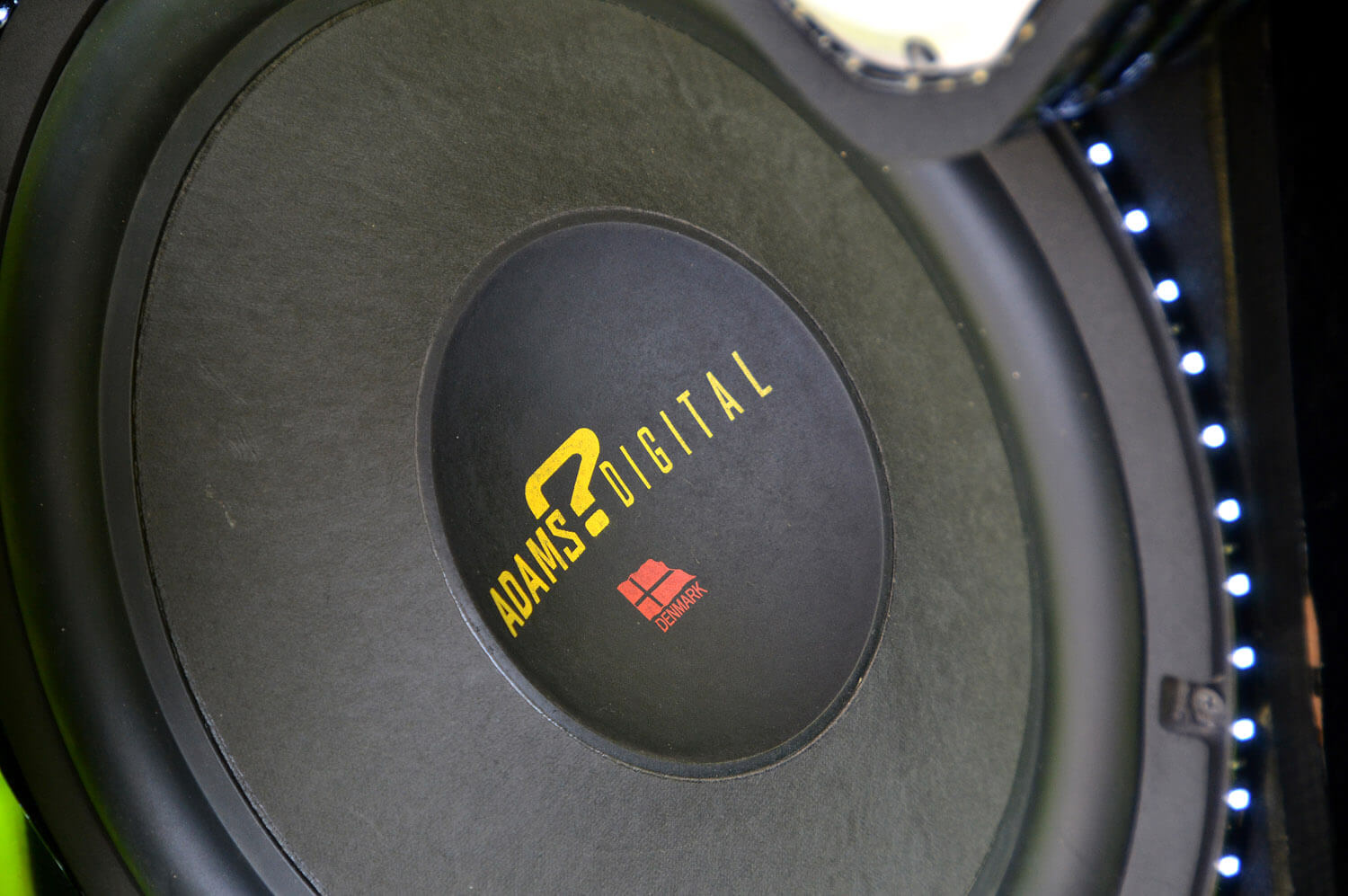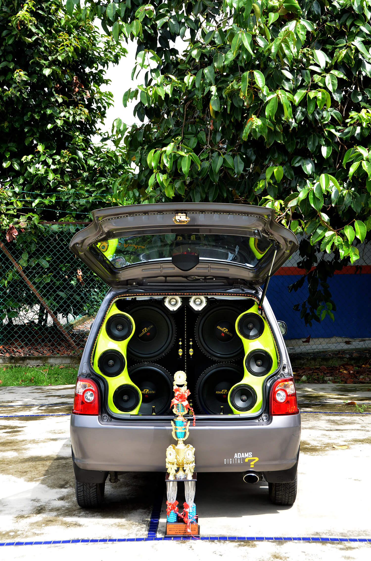 Kesemua sistem yang dibina tertumpu di bahagian belakang sahaja. Ia adalah tipikal sistem audio yang dibuat pada sebuah kereta kecil seperti Kancil. Sistem ini menampilkan empat unit woofer 15” yang kini agak terhad pilihannya dalam industri. Salah satu pengeluar yang masih ada ialah Adams Digital. Dengan ukuran dan teknik pemasangan yang betul, woofer ini sedang elok disusun dalam ruang menegak dalam perumah yang diperbuat dari papan 5mm. Ia kemudiannya dibalut dengan lapisan fabrik hitam. Woofer ini mendapat bekalan kuasa dari 2 unit amplifier monoblock Adams Digital EXA-2500.1D.
