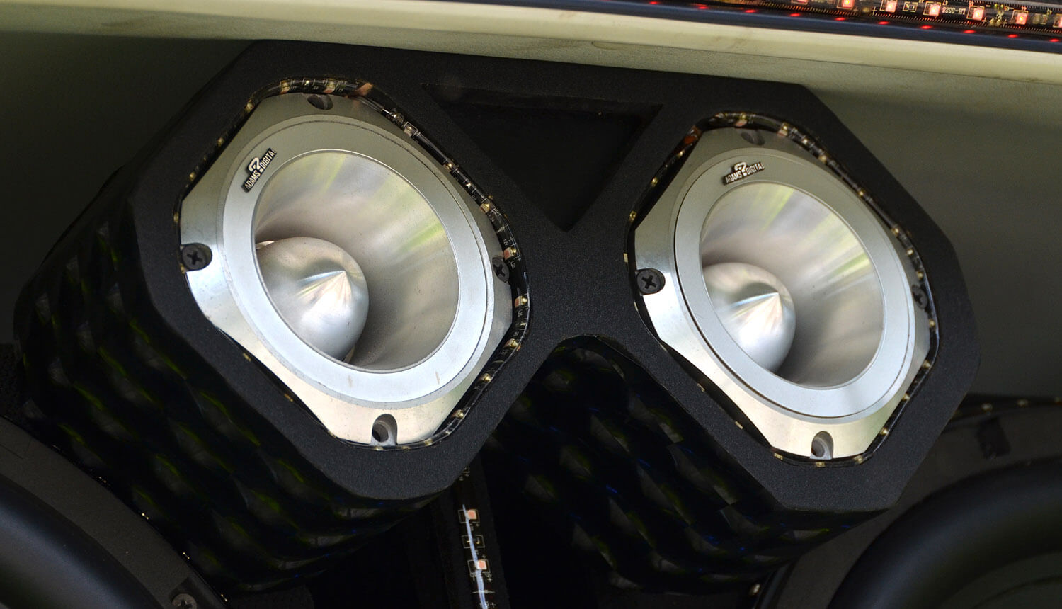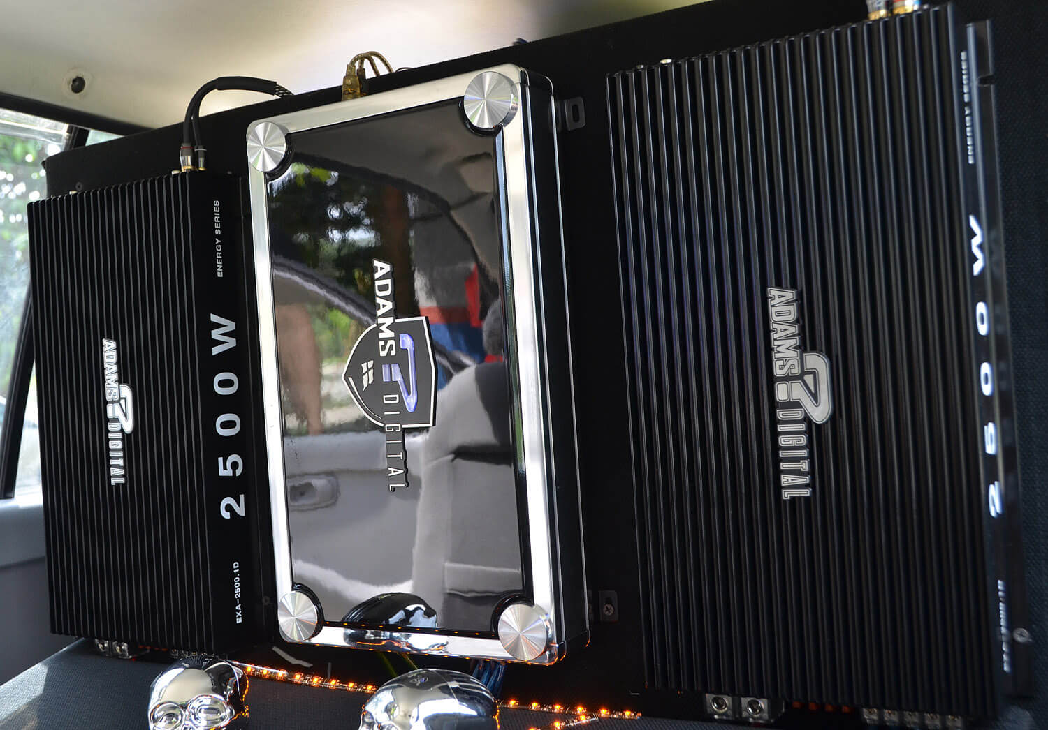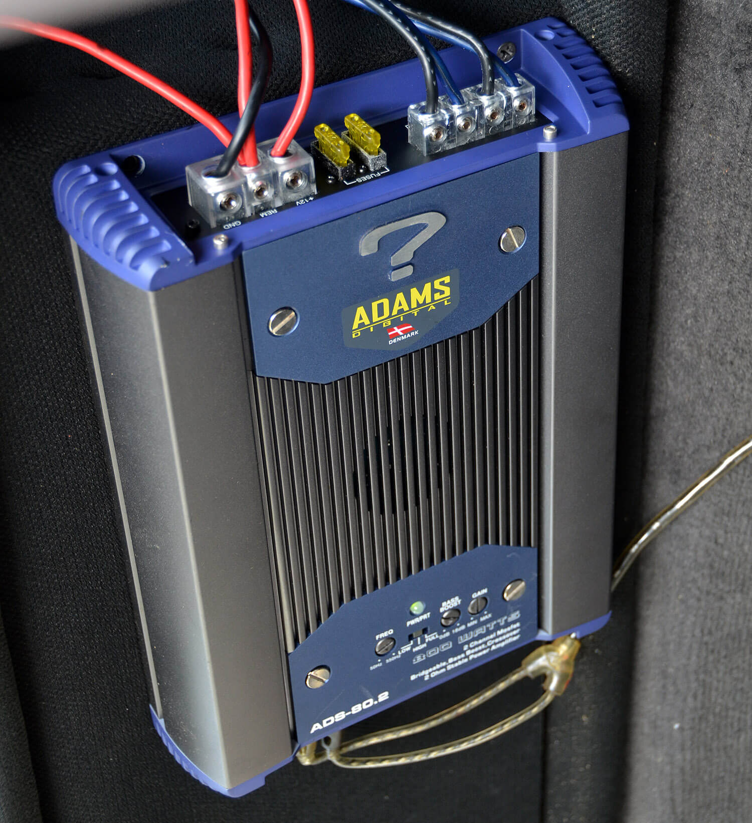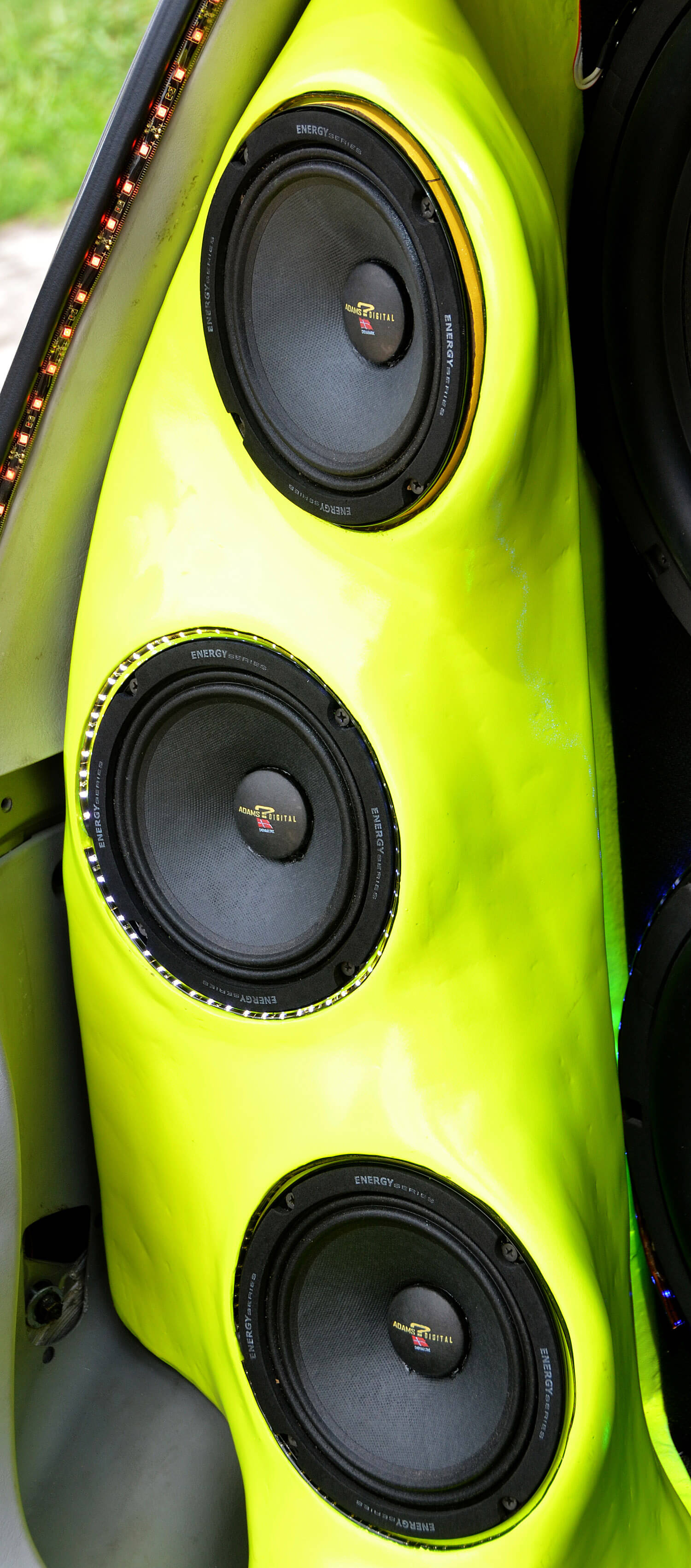 Lengkap dengan woofer, sisi kereta ini dipasangkan pula dengan enam unit mid bass Adams Digital EX-600 yang dikuasakan oleh amplifier 2 channel Adams Digital EDD200.2. Jika anda pengikut Adams Digital, mid bass ini antara yang menghasilkan bunyi ‘lantang’, sesuai untuk mendapatkan ritma SPL luaran yang mementingkan kuasa berbanding segalanya. Melengkapi set mid ini ialah 2 unit tweeter jenis horn yang diletakkan pada posisi paling atas di kawasan pembinaan sistem tadi. Bagi unti tweeter ini pula, dikuasakan oleh amplifier 2 channel Adams Digital ADS-80.2.