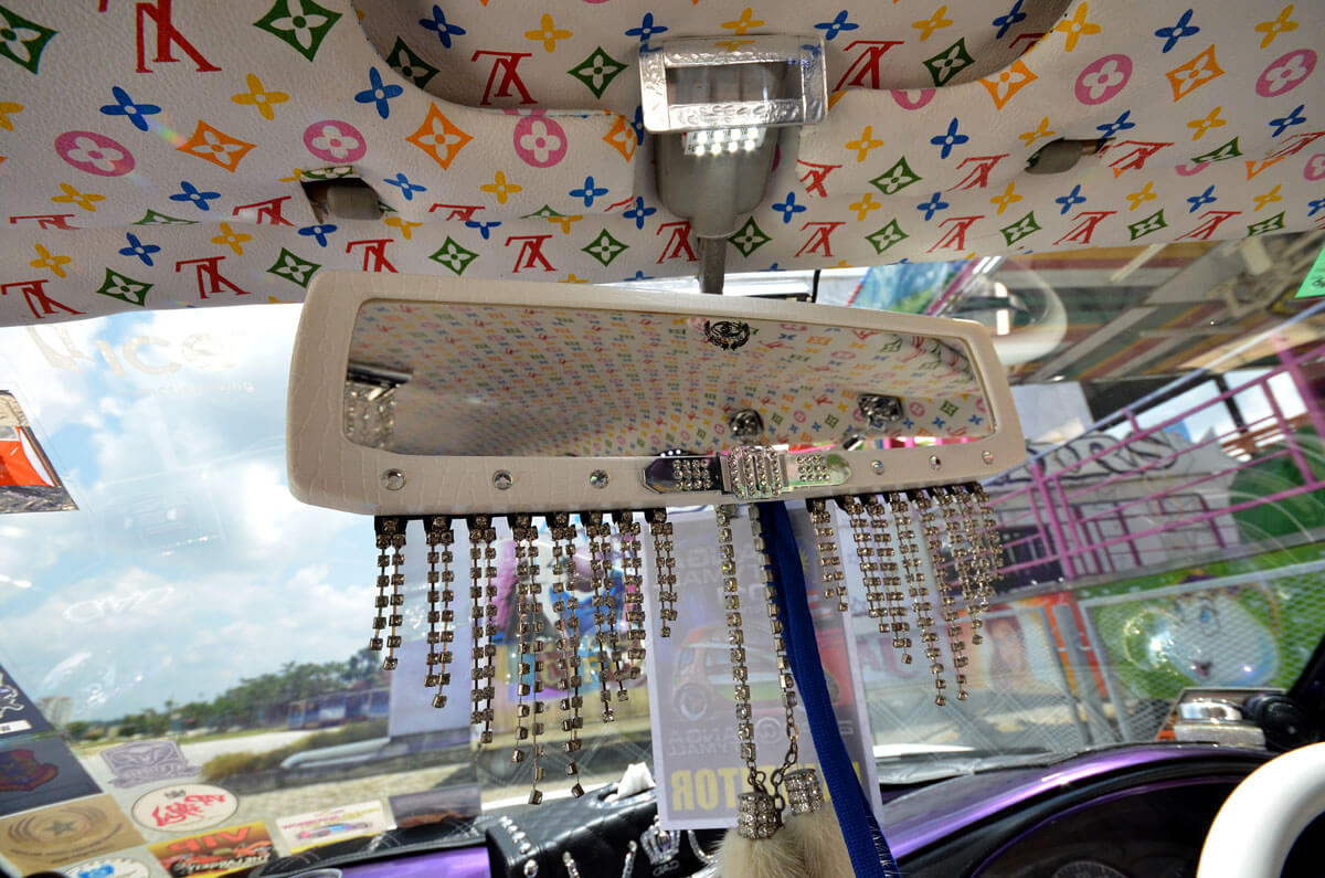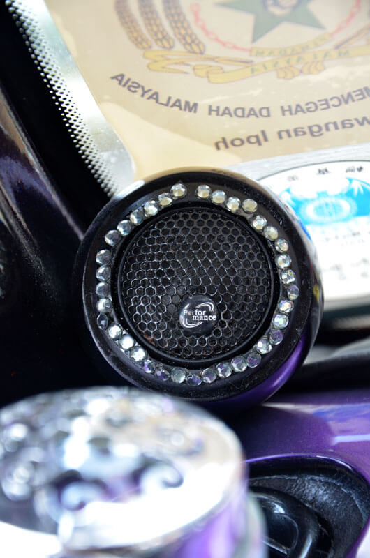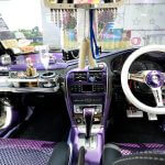 Seperti yang saya ceritakan di pembuka bicara tadi, bahagian dalaman kereta ini diubahsuai dengan tema VIP yang sangat ekstrem. Panel pintunya dibuat semula dengan bahagian gentian kaca dan semburan ungu mutiara, lelangit bumbung dibalut dengan fabrik Louis Vuitton, tempat duduk ‘bucket’ hadapan disalut dengan bahan berkilat yang saya sendiri tidak pasti ianya fabrik atau plastik.