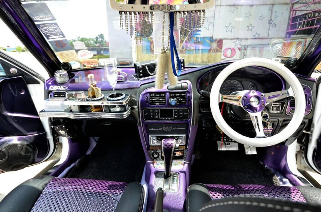Bahagian lantai dan kesemua vinyl diwarnakan dengan tema ungu. Aksesori seperti meja hidangan, kotak tisu, lampu gantung, ‘tray’ dan juga manik-manik swarovski menguasai bahagian dalaman kereta ini dengan ketara. Kombinasi modifikasi + audio + enjin meletakkan Wira ini dalam kelasnya yang tersendiri. Setiap bahagian pada kereta ini mendapat sentuhan kritikal pemiliknya.