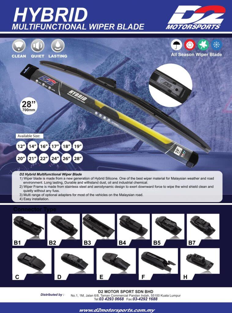 Selain itu, bilah pengelap hibrid pelbagai fungsi dari D2 ini tahan lama, tahan karat, minyak dan juga bahan kimia perindustrian. Bingkainya diperbuat dari besi tahan karat dengan rekaan aerodinamik untuk mengelap cermin dengan bersih dan dalam masa yang sama tidak mengeluarkan bunyi bising. Terdapat dalam pelbagai pilihan yang sesuai dengan kereta serta kenderaan yang digunakan di atas jalan Malaysia dan mudah dipasang.