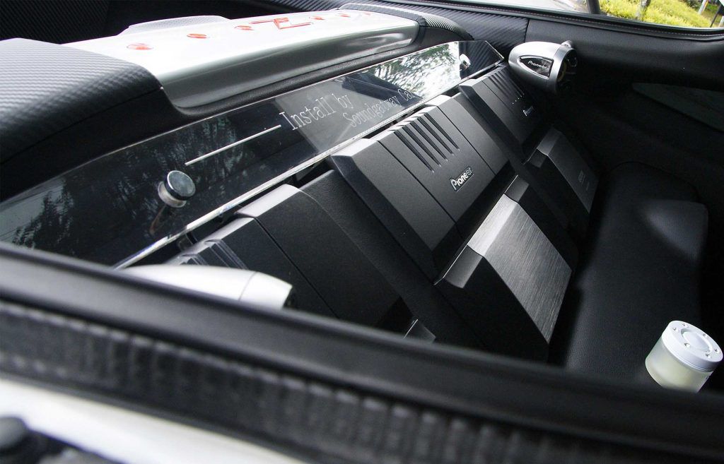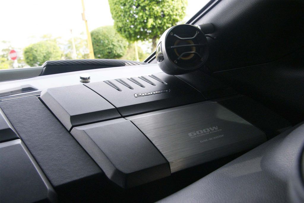 Sebelum dihantar ke rangkaian speaker, isyaratnya diperkuatkan dengan 4 unit amplifier yang berbeza fungsi. 2 unit amplifier 4 channel Pioneer GM6300F digunakan untuk memandu kesemua speaker (kecuali woofer). Ia bermula dengan speaker tengah (centre speaker) Pioneer TSCX900 yang diletakkan di bahagian tengah papan instrumentasi. Pemasangan speaker seperti ini biasanya bertujuan untuk menyokong bunyi keliling yang dihasilkan ketika pemain memainkan DVD.