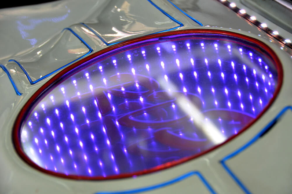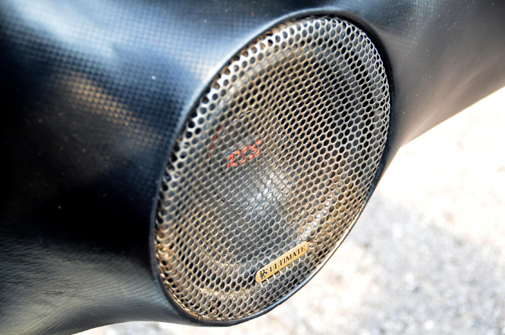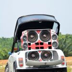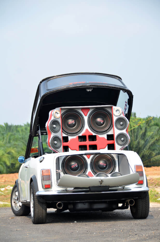 Di bahagian but kereta ini ialah 4 unit mid bass Q Mobile lagi. Bezanya, ia dipasangkan pada perumah buatan gentian kaca yang mana kalau diukur betul-betul, nampak sendat sangat. Al-maklumlah, apalah sangat saiz but Mini ini. Tapi di sinilah daya kreatif diperlukan installer untuk menyesuaikannya supaya pada hasil akhir nanti speaker ini tidak hanya menjadi hiasan. Rangkaian mid ini dikuasakan seunit amplifier 2 channel RDS 500.2.