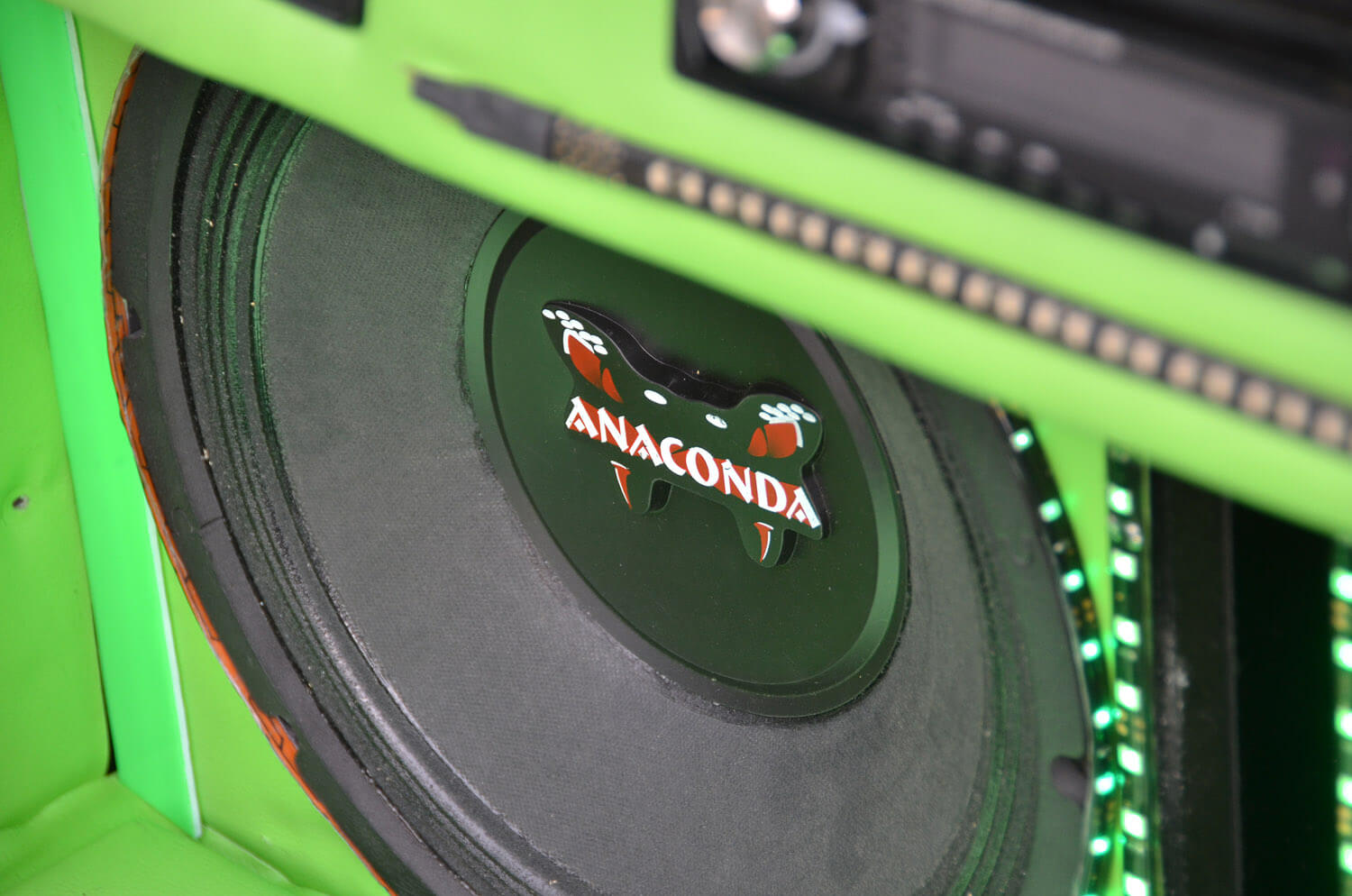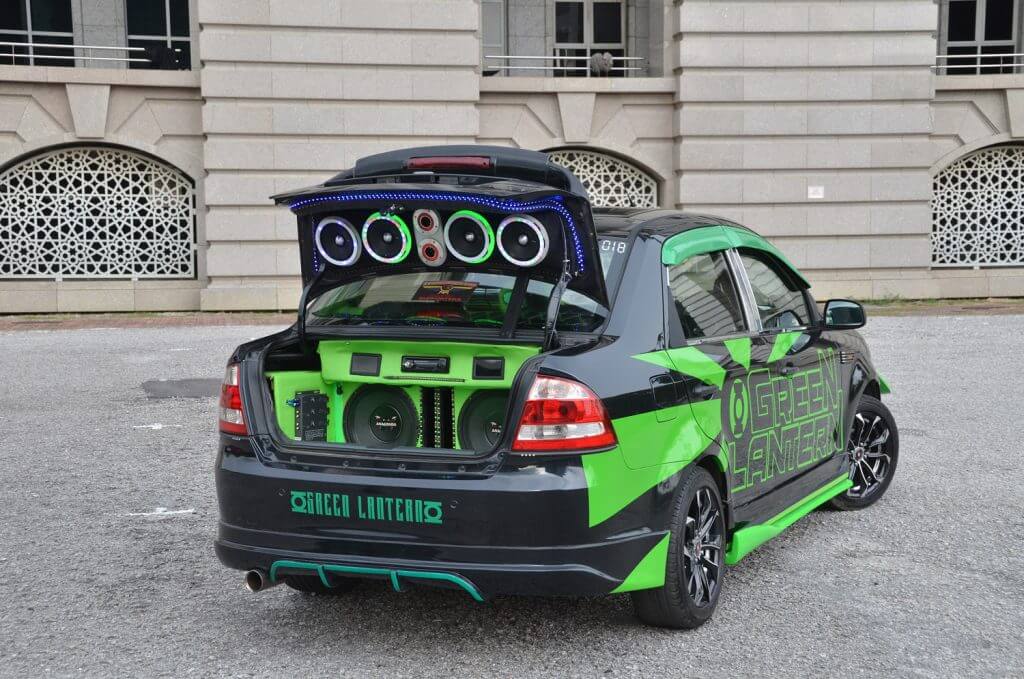 Amplifier dua saluran tadi bertugas memandu dua unit woofer 12” Anaconda PA12 yang diletakkan di bahagian but belakang. Woofer ini dipasangkan dalam lapisan kedap udara menerusi pembuatan kotak khas dari papan kayu tebal. Perumah ini dibina menggunakan lapisan akhir PVC hijau, sama seperti tema keseluruhan kereta ini.