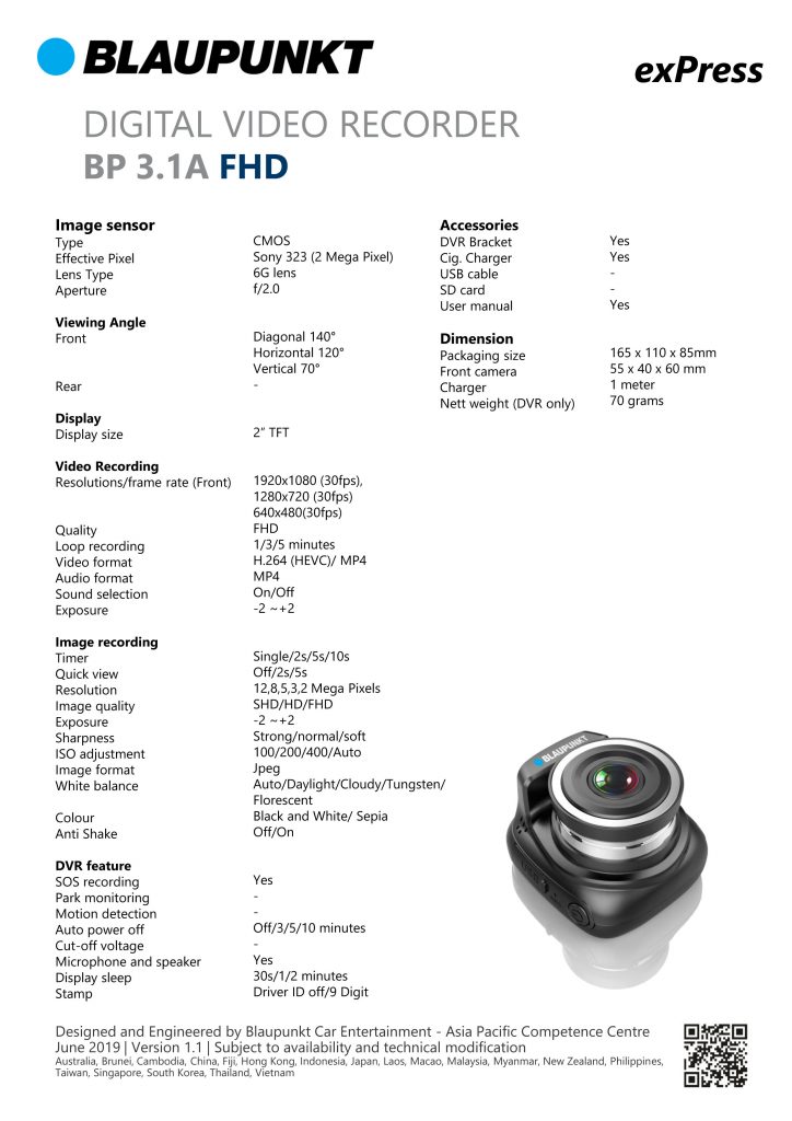 Sebagaimana perakam video digital Blaupunkt yang lain, BP 3.1A FHD ini direka agar dapat berfungsi secara optimum selain mempunyai beberapa ciri istimewa. Peranti ini turut dilengkapi dengan pelbagai spesifikasi menarik seperti keluasan sudut pandang 140°, ia juga mempunyai keupayaan untuk dikendalikan menerusi aplikasi kawalan tanpa wayar.