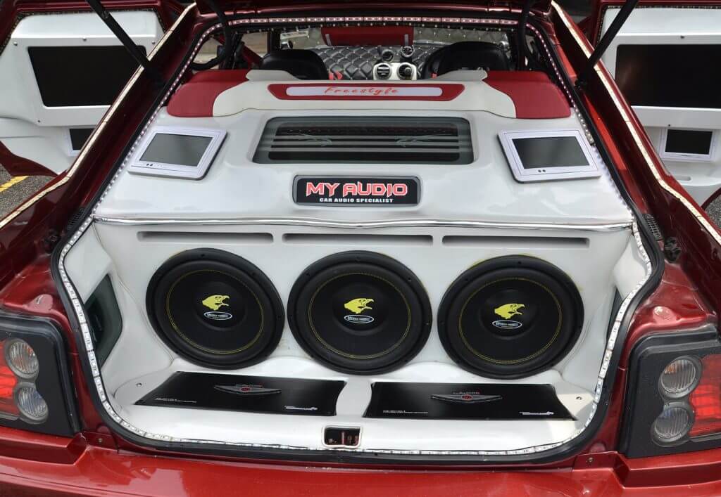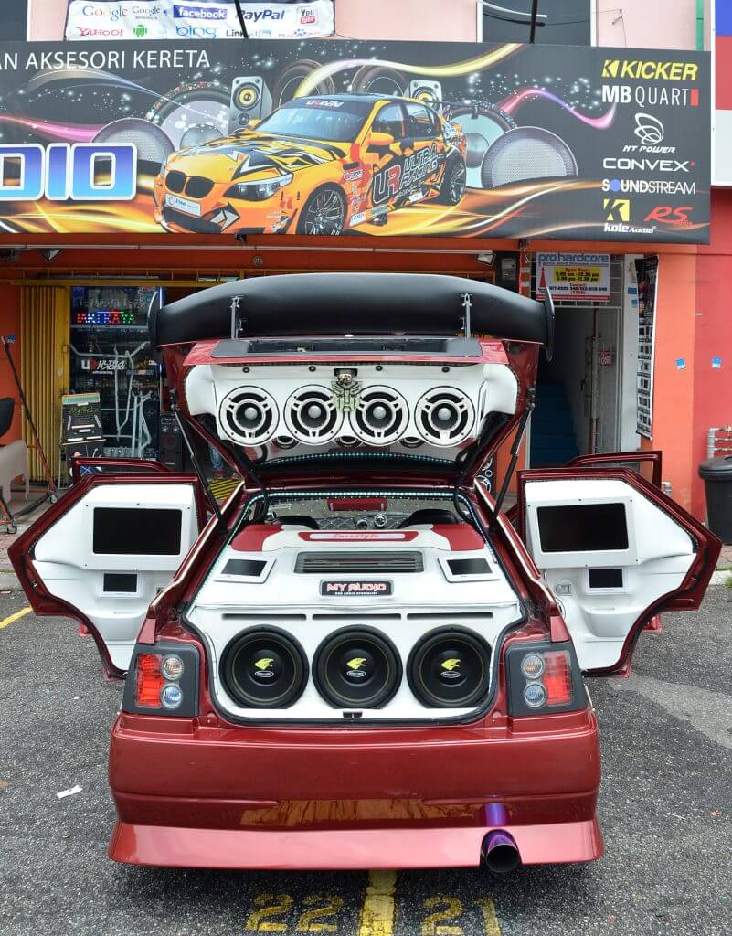 Setelah memujuk pihak pengurusan, akhirnya saya dibenarkan untuk memasukkan artikel kereta ini. Tiada yang luarbiasa jika anda perhatikan laluan pemasangannya kerana kereta ini dibina secara tradisi mengikut stail old school. Metodologi pembinaannya ialah menempatkan seberapa banyak unit speaker yang boleh dilokasi berbeza dengan tujuan menzahirkan bunyi dari pelbagai sudut. Satu perkara yang pasti, penalaannya tidaklah mudah sementara kemasukan monitor bersaiz 14” di kiri dan kanan pintu belakang mengingatkan saya kemeriahan petak autoshow di era beberapa tahun yang lalu.