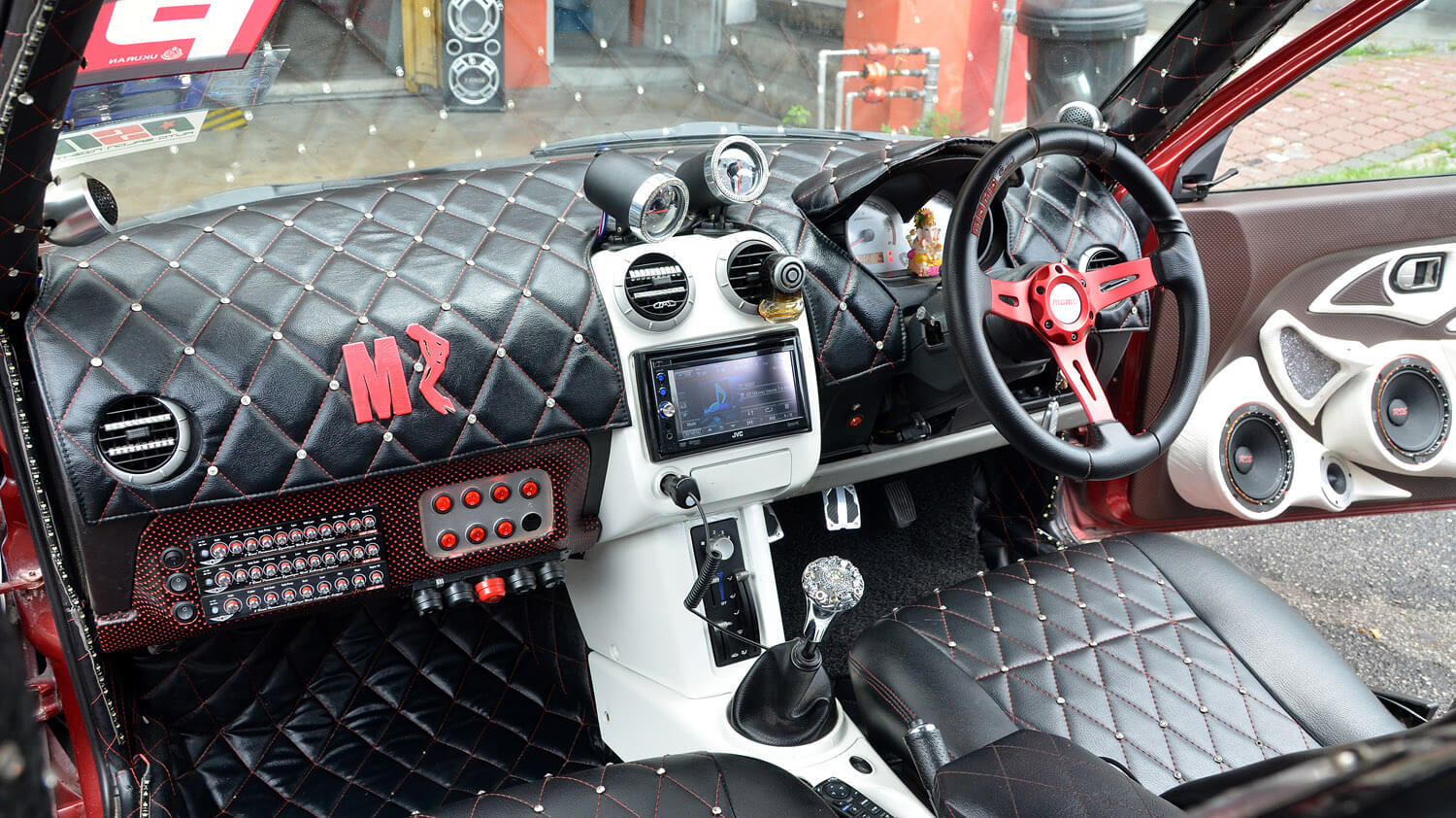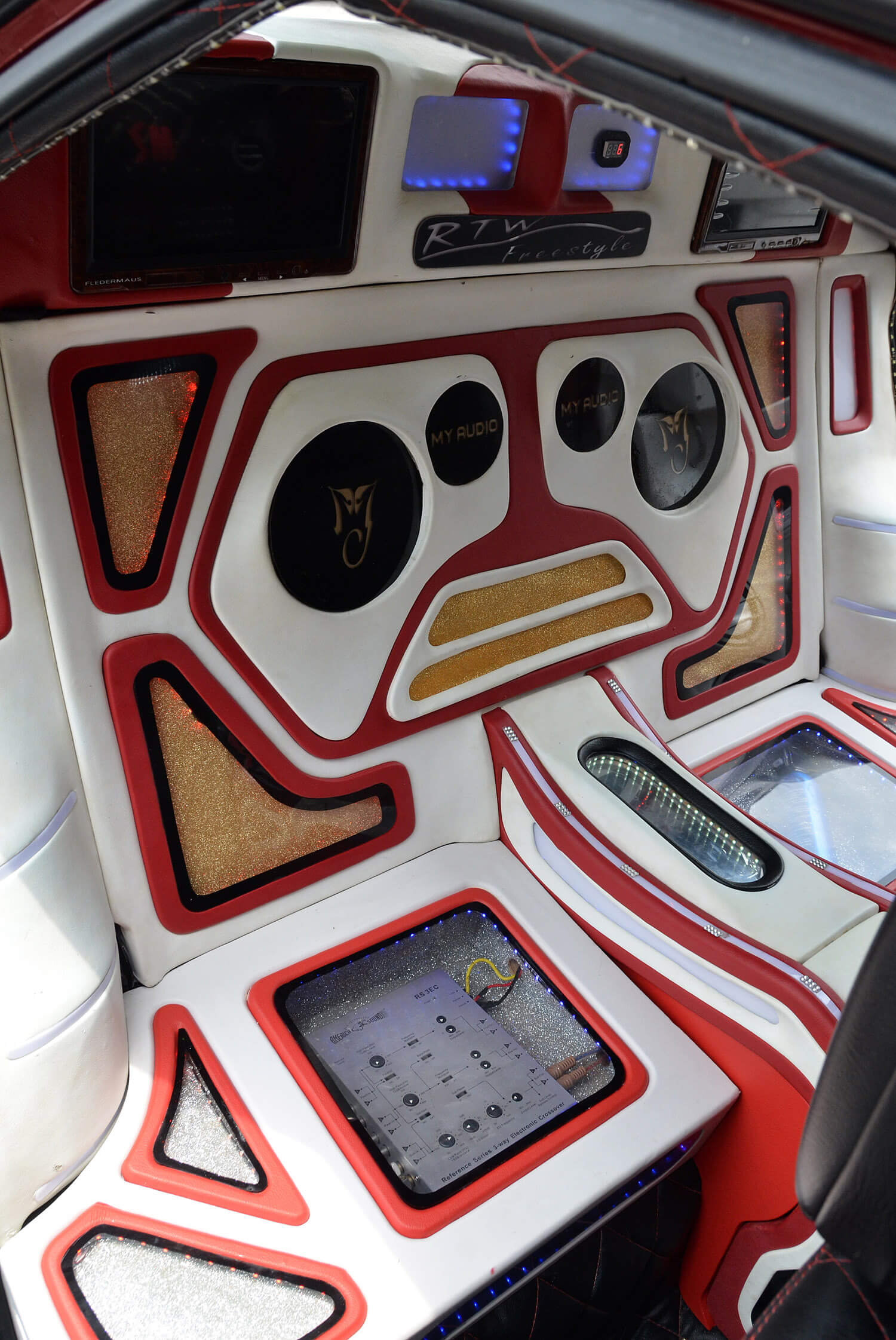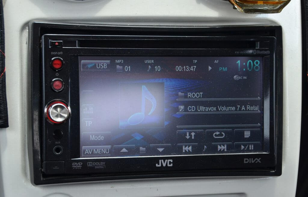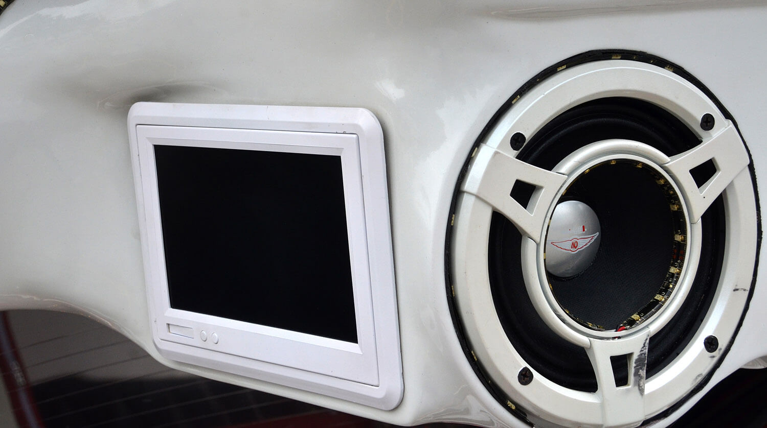 Pemain utama kereta ini ialah dari JVC jenis 2-din dengan keupayaan paparan visual dari media DVD. Perhatikan kombinasi keseluruhan, laluan seterusnya ialah pembinaan bahagian kokpit yang merangkumi set komponen RDS di hadapan yang diperkuatkan dengan seunit amplifier 4 saluran Audio Quart. Set komponen ini dipasangkan terus ke bahagian panel pintu untuk empat unit mid dan dua unit tweeter. Kelihatannya seperti overkill tetapi dengan teknik pemasangan menggunakan tapak gentian kaca, kemasan akhirnya masih boleh diberikan pujian. Pemasangan ini disusuli dengan rekabentuk futuristik gaya bebas yang mungkin diilhamkan dari kapal angkasa sains fiksyen Star Trek yang mahsyur itu.