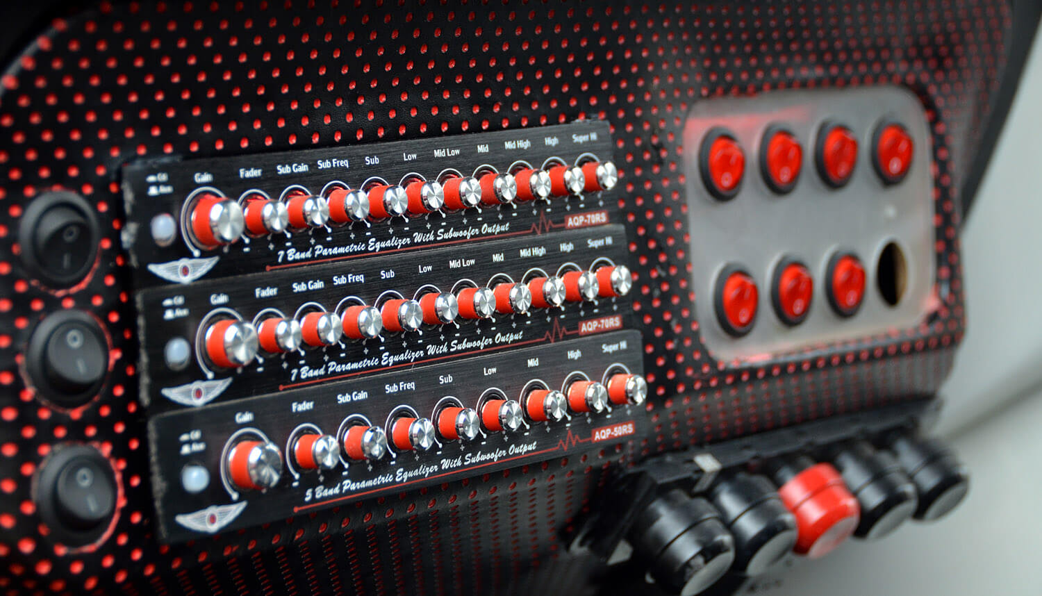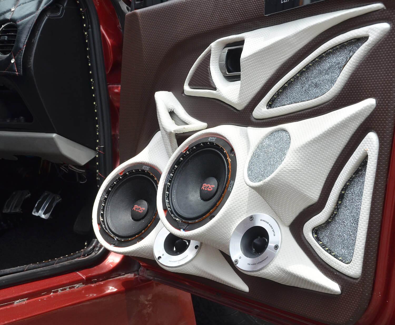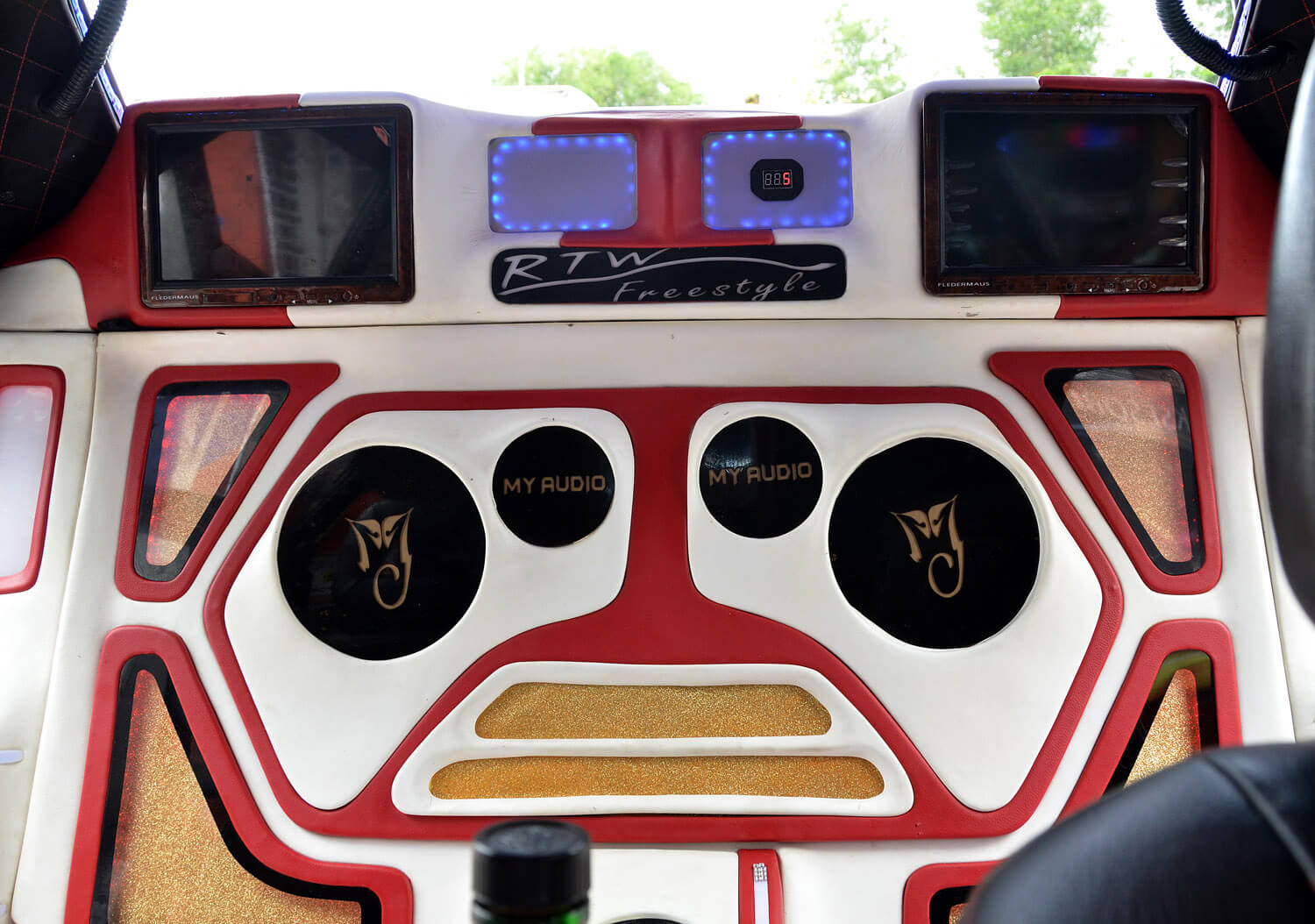 Pemain utama kereta ini ialah dari JVC jenis 2-din dengan keupayaan paparan visual dari media DVD. Perhatikan kombinasi keseluruhan, laluan seterusnya ialah pembinaan bahagian kokpit yang merangkumi set komponen RDS di hadapan yang diperkuatkan dengan seunit amplifier 4 saluran Audio Quart. Set komponen ini dipasangkan terus ke bahagian panel pintu untuk empat unit mid dan dua unit tweeter. Kelihatannya seperti overkill tetapi dengan teknik pemasangan menggunakan tapak gentian kaca, kemasan akhirnya masih boleh diberikan pujian. Pemasangan ini disusuli dengan rekabentuk futuristik gaya bebas yang mungkin diilhamkan dari kapal angkasa sains fiksyen Star Trek yang mahsyur itu.