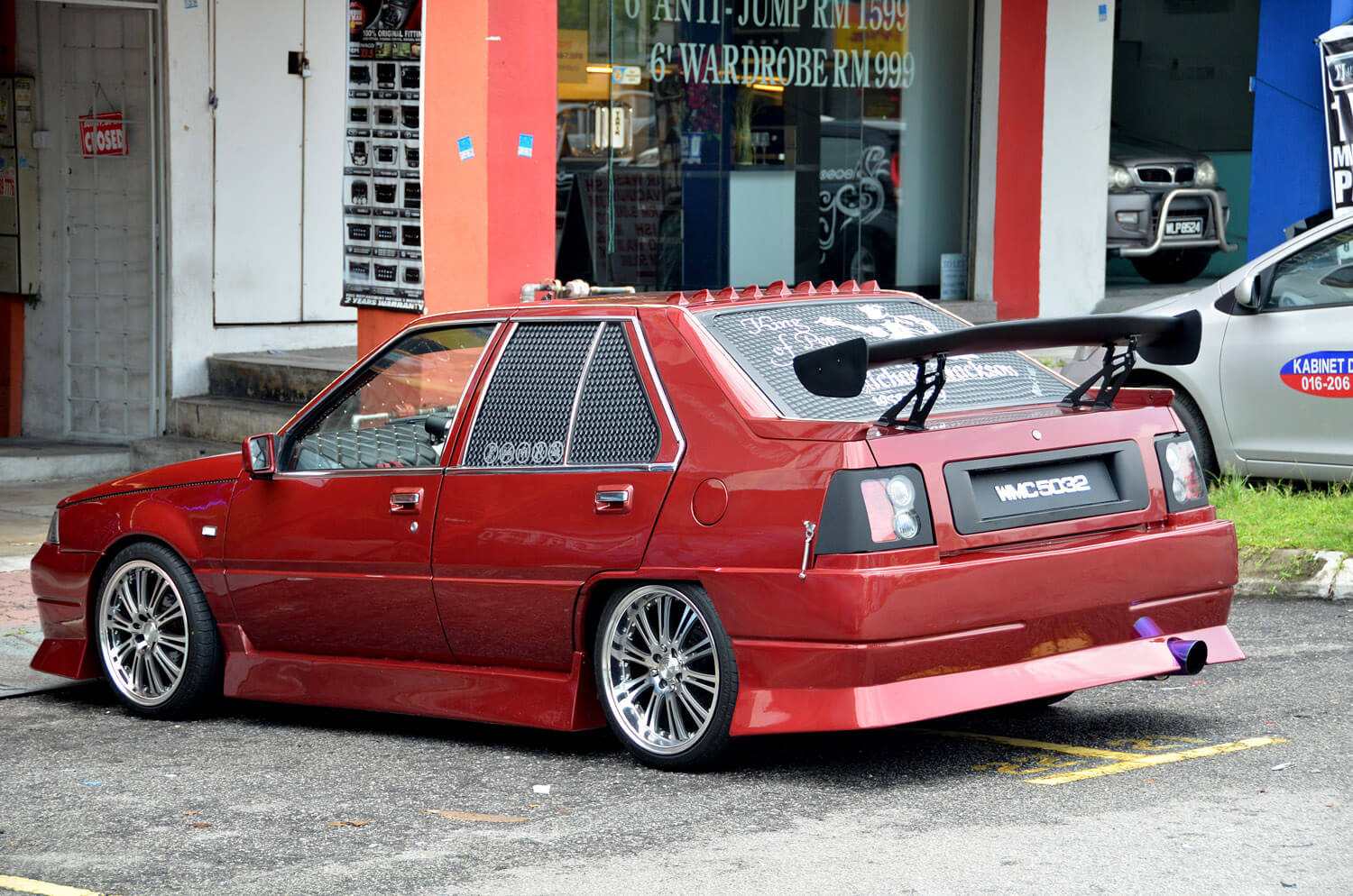 Tidak cukup dengan empat mid di pintu hadapan bahagian kerusi belakang kereta ini ditanggalkan untuk memuatkan empat lagi mid bass dari Audio Quart pula tetapi tanpa tweeter. Fabrikasi bahagian belakang ini dibuat dengan teliti menggunakan kombinasi PVC berwarna oren dan putih. Amplifier Audio Quart 2 channel sebanyak 2 unit turut berada di lokasi yang sama dengan unit pre-amp AQ 7 band, pre-amp AQ 5 band, kotak fius dan 2 unit monitor TFT bersaiz 7”. Anehnya, monitor ini dihalakan semula ke bahagian hadapan yang mana satu persoalan timbul. Siapa yang nak menontonnya?