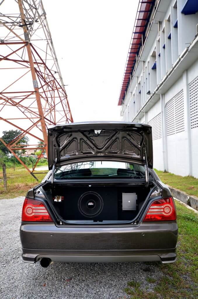 Melengkapkan sistem ini ialah seunit woofer 10” German Maestro dari Five Series; 5W10. Woofer ini dipasangkan ringkas sahaja; dalam sebuah kotak kayu di dalam but belakang. Tiada hiasan berwarna warni atau limpahan lampu neon. Warna temanya juga mudah iaitu hitam. Keseluruhan bahagian but belakang kereta ini juga kelihatan sangat ‘normal’ kalau mengikut standard jurugambar kami yang biasanya hilang fokus bila melihat but yang penuh dengan aksesori berwarna warni.