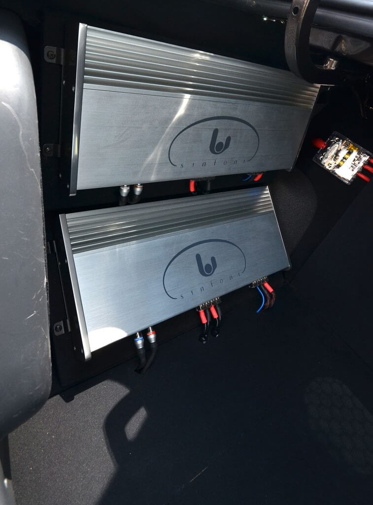 Sebanyak 4 unit amplifier Sinfoni Grave 165.2 dipasangkan untuk memperkasakan kuasa yang diperlukan. Saya juga tidak berapa arif, rasional di sebalik pemasangan 4 unit amplifier ini kerana secara teorinya, tiga sudah cukup untuk memnbekalkan kuasa pada kesemua speaker yang digunakan. Namun, semuanya berbalik kepada kepuasan dan yang paling penting, kemampuan untuk memiliki apa yang dikehendaki hati serta secocok dengan citarasa. Itulah yang dipraktikan oleh pemilik kereta Waja ini.
