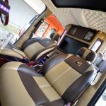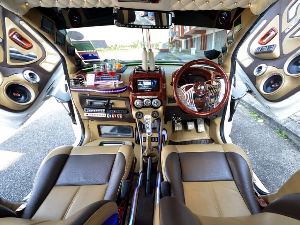 Sentuhan dalaman yang dibuat pada Myvi ini termasuklah pemadanan aksesori audio visualnya yang canggih. Di bahagian kerusi belakang terletak seunit TV LED 32” yang diletakkan melintang pda posisi penyandar kerusi yang telah ditanggalkan. Susunan amplifier, balutan semula kerusi dengan PVC 2 tona memberi penyudah yang menakjubkan dalam merealisasikan impian pemiliknya untuk menghasilkan sebuah kokpit yang dominan.