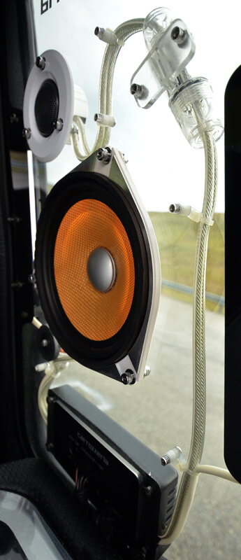 Satu lagi unit amplifier menjalankan tanggungjawab yang lebih besar. Keseluruhan channel keluarannya diagih-agihkan kepada unit komponen Gladen Zero Line 165 (terdiri dari mid bass dan tweeter) di bahagian hadapan, manakala speaker komponen Carrozeria untuk bahagian belakang kereta (cermin D belakang atau lebih dikenali dengan nama speaker ‘D’). Speaker ini memang dikeluarkan di Jepun oleh Carozzeria khas untuk model Move L900.