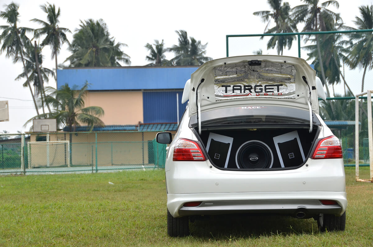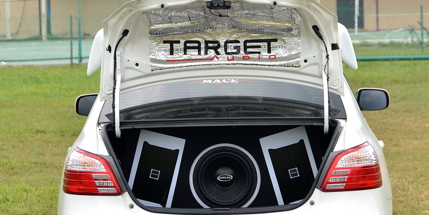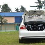 Pemain ini terus sahaja disambungkan dengan dua unit amplifier Target Audio; TA-74.4 dan TA-120.2. Masing-masing dengan keluaran kuasa 4 saluran 75watt RMS (75X4) dan seunit lagi 120X2, bermaksud 120 watt setiap channel untuk dua saluran. Walaupun sistem kereta ini agak ringkas tetapi kesempurnaan pemasangannya tidak diabaikan. Ya, kesempurnaan yang diutamakan. Kedua-dua amplifier ini digandingkan bersama dalam kotak woofer di belakang. Di tengah-tengahnya ialah seunit woofer dual-magnet 1200 watt Stellar. Kon woofer ini dihalakan terus ke bahagian luar menjadikan kebuk buatan kayu tersebut padat dengan sumber bunyi bass yang optimum.