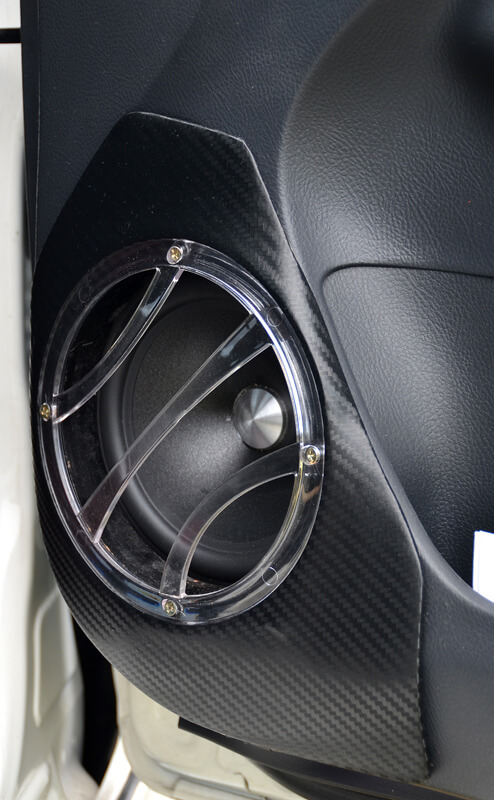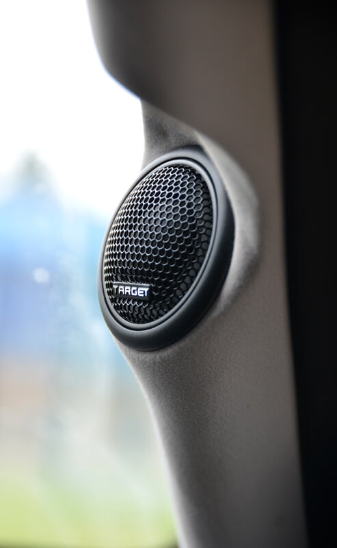 Seunit lagi amplifier dipertanggungjawapkan untuk memancarkan kuasa kepada set komponen di hadapan. Sistem dua hala di kabin ini menggunakan set speaker mid bass dan dua unit tweeter daripada Target Audio TDK-165. Tiada yang berbeza dari sistem yang biasa kita lihat. Dua unit mid dipasang menggantikan lokasi panel speaker di bahagian pintu sementara dua unit tweeter dipasang dalam perumah rekaan khusus menerusi kerja fabrikasi pada penutup pillar A depan.