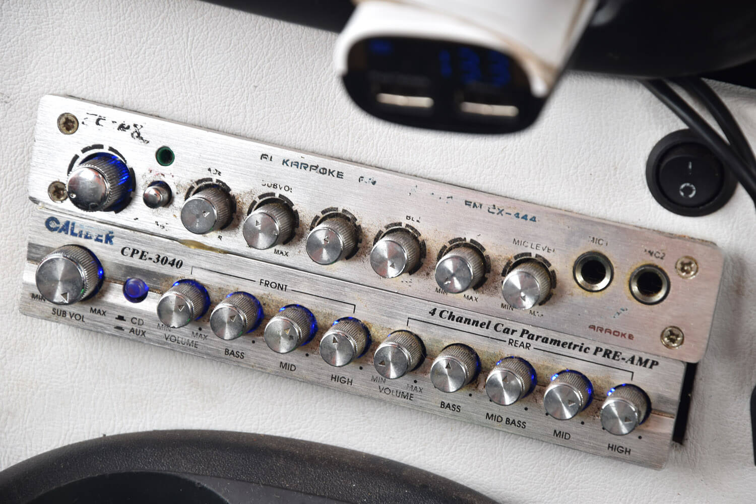 Seterusnya, sistem audio ini dipasangkan pula dengan 2 unit pre-amp 7 band, Platinum X untuk bahagian dalam dan 2 unit lagi untuk bahagian luar (bonet belakang). Sebanyak 8 unit mid 6.5” PA speaker dari G1 Motor dan juga 6 unit tweeter dari jenama sama telah digunakan untuk membina satu sistem audio yang sangat padu dan meriah bunyinya. Bagi menguasakan kesemua speaker ini, Agon telah menggunakan amplifier monoblock (modified) G1 Motor untuk mid dan amplifier 4 channel untuk tweeter tadi. Agak pelik juga tetapi hanya saudara Agon tahu rahsia di sebalik pemasangan ini.