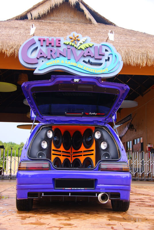 Semua pembesar suara kereta ini ditumpukan di bahagian but. Namun untuk memuatkan kesemuanya, kaedah penyediaan yang teliti telah dibuat oleh pihak Funky Audio dengan membuat sebuah kotak menggantikan tempat duduk belakang dan ruang but. Kotak ini juga dipecahkan kepada dua bahagian utama, di tengahnya untuk set woofer sementara di kedua-dua sisi untuk mid dan tweeter. Lantai but belakang pula masih ada ruang untuk dimuatkan lagi dengan sepasang woofer lagi.