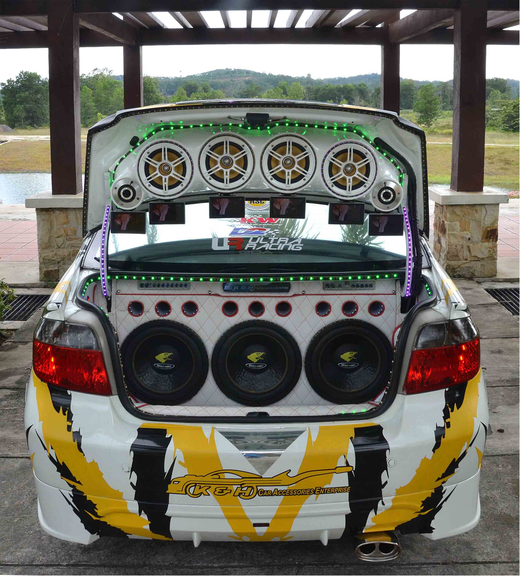 Tumpuan sebenar sistem audio kereta ini adalah pada saluran kedua yang dikepalai seunit lagi pre-amp 7 band yang diakhiri sekumpulan speaker di bahagian but belakangnya. Tidak ada sedikitpun ruang yang ditinggalkan. Bootlid dilekapkan dengan 4 unit speaker komponen 6” dan 2 unit tweeter jenis horn. Kesemua unit ini dipasangkan pada perumah khas yang diperbuat dari bahan gentian kaca yang diakhiri dengan warna putih mengikut tema keseluruhan kereta. Pembahagian kuasa pusat dibuat dengan sambungan kepada 2 unit amplifier 2 channel Classic Series CS2.250. Tak cukup dengan itu, pada setiap bahagian bawah speaker ini pula dipasangkan dengan monitor 4.3 inci yang memaparkan imej visual dari pemain Dvd JVC tadi.