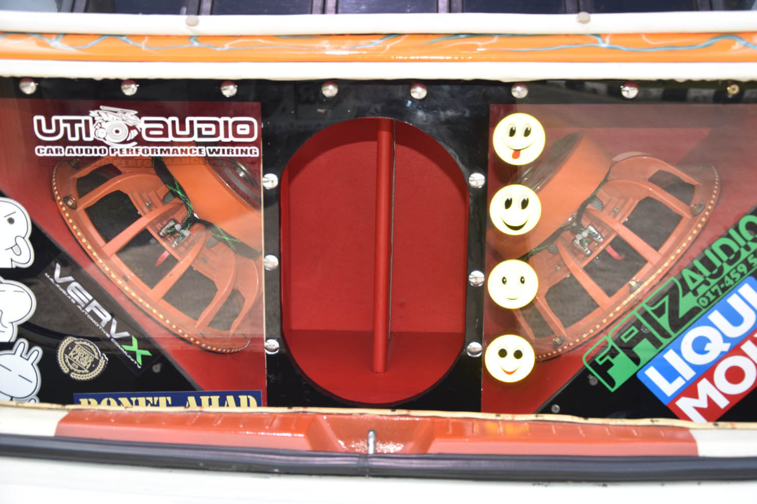 Kecemerlangan sistem audio Myvi ini diteruskan lagi dengan binaan sebuah perumah custom made yang dipasangkan di bahagian belakang atau tepat lagi, di bahagian bonet. Perumah yang dibina dengan cukup unik ini menempatkan 4 unit mid bass DK dan dua unit tweeter. Di bahagian bawah pula ditempatkan sebuah perumah yang dipasangkan dengan kaca kaca arkilik sebagai penutup yang menempatkan dua unit woofer. Woofer ini pula dipasangkan secara terbalik bagi menghasilkan bunyi bass yang lebih padat. Kesemua unit ini dikuasakan oleh seunit amplifier DTS. Selain itu, UTI Audio turut memasang perumah khas yang menempatkan 7 unit monitor.