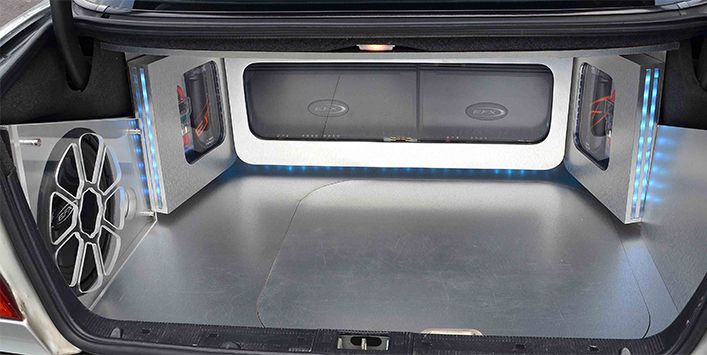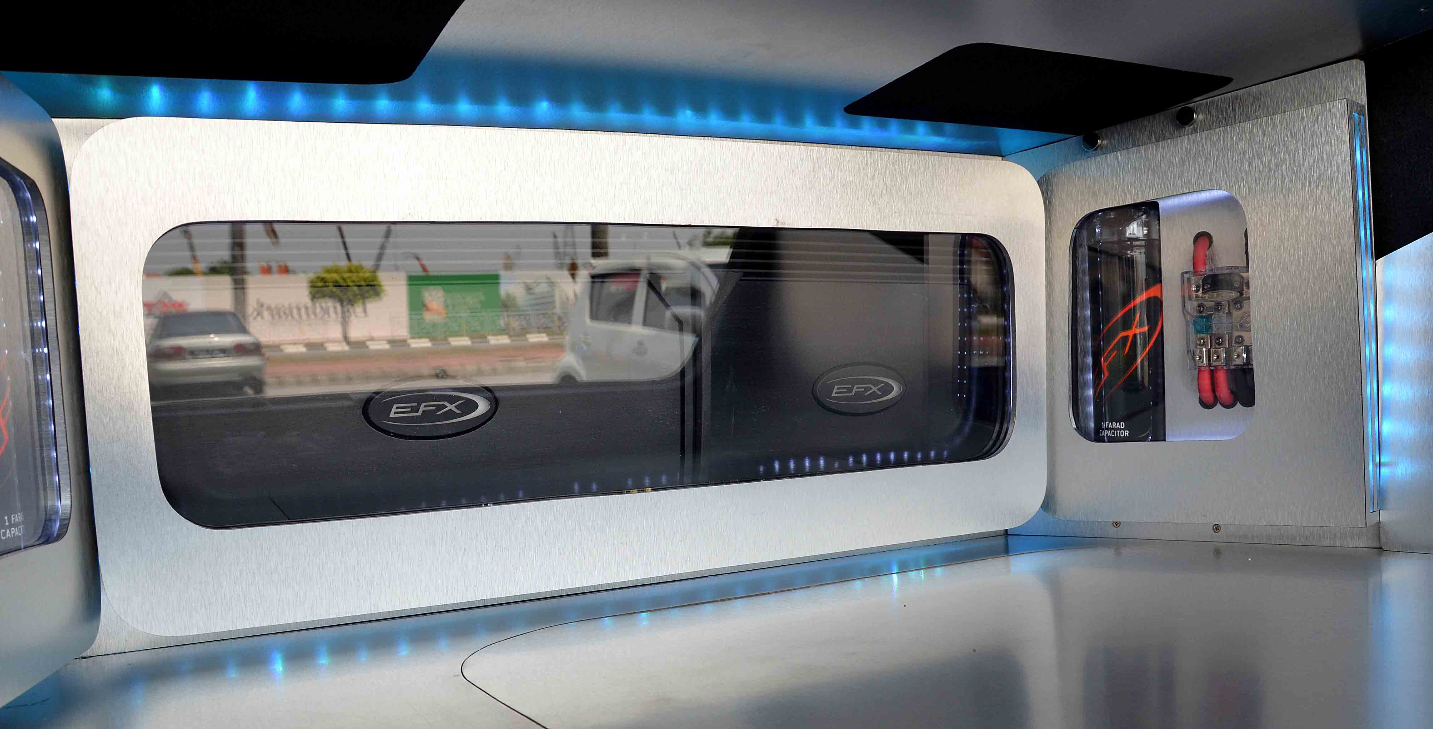 Seunit woofer 12” EFX P124 dipasang di dalam but belakang. Berbeza dari kaedah semasa yang menempatkan woofer di belakang kerusi, woofer ini dipadankan di penjuru but kereta. Estetik mungkin sebahagian daripada matlamat pemasangan ini tapi dari apa yang didakwa oleh pemasangnya, kesannya nyata lebih baik. Woofer ini mendapat bekalan kuasa daripada amplifier kelas D monoblok EFX 500C1. Amplifier ini bersama amplifier 4 channel tadi dipasang pada but dengan kemasan perak. Mengapit posisi amplifier ini ialah 2 unit kapasitor 2 .0 farad. Kemasan dalam but ini juga agak aneh dengan penggunaan warna silver yang dominan. Bukan itu sahaja, material yang digunakan juga adalah hampir sepenuhnya daripada kayu.
