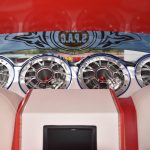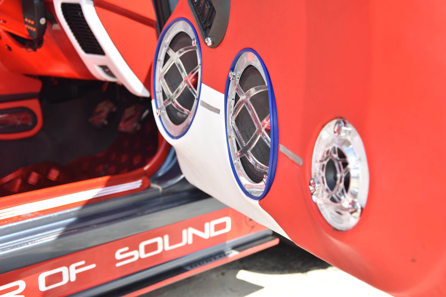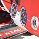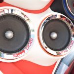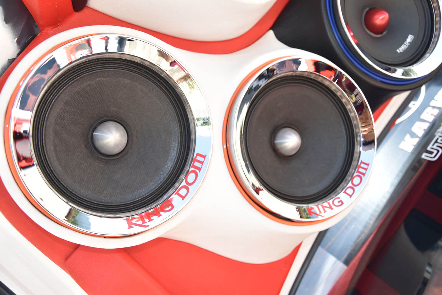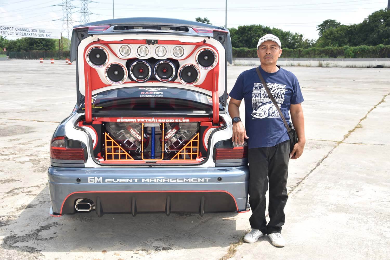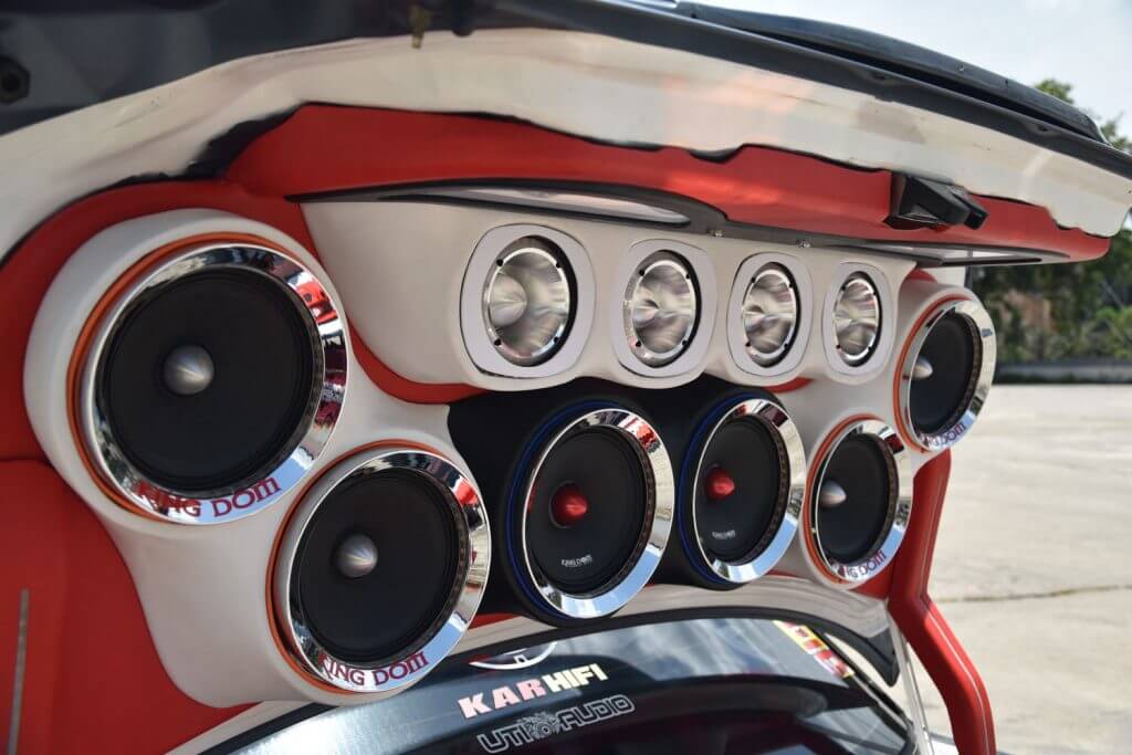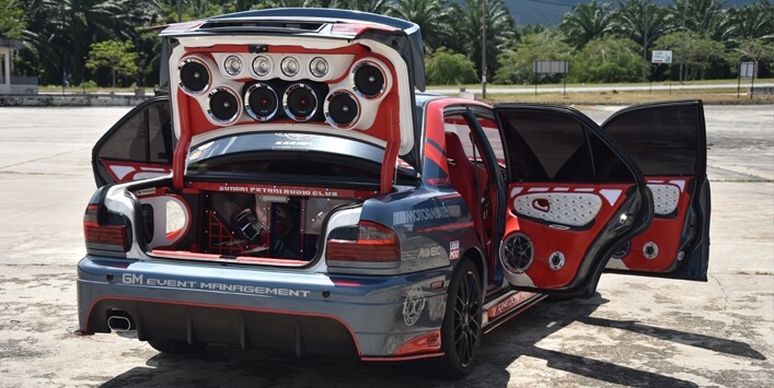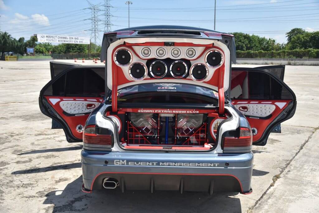 Selesai sistem audio di bahagian dalam dan beralih pula ke bahagian audio yang dipadatkan di bahagian belakang. Dilengkapi perumah khas pada bahagian bootlid yang menempatkan barisan speakar dari 6 unit mid 6” Kingdom dan juga 4 unit tweeter yang disusun kemas dan teratur. Kesemua speaker ini dikuasakan dua unit amplifier 4 channel. Bagi mendapatkan bunyi yang cemerlang, pihak UTI Audio turut memasang 2 unit pre-amp 10 band dan 7 band dari Sound Match. Sebagai pelengkap dan memberi keseimbangan kepada setiap bunyi yang dihasilkan setiap speaker, dua unit woofer 12” Kingdom yang ditempatkan dalam perumah dengan penutup kaca arkilik secara terbalik untuk mendapatkan bass yang lebih padu. Kedua-dua woofer ini dikuasakan pula oleh seunit amplifier monoblock.